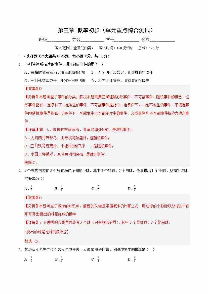 第三章 概率初步(单元重点综合测试)(解析版)