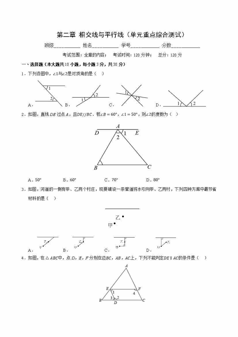 第二章 相交线与平行线(单元重点综合测试)(原卷版)