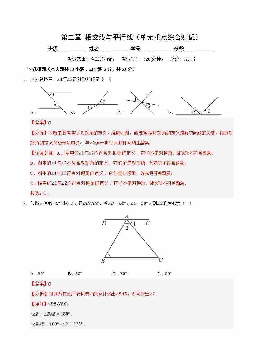 第二章 相交线与平行线(单元重点综合测试)(解析版)