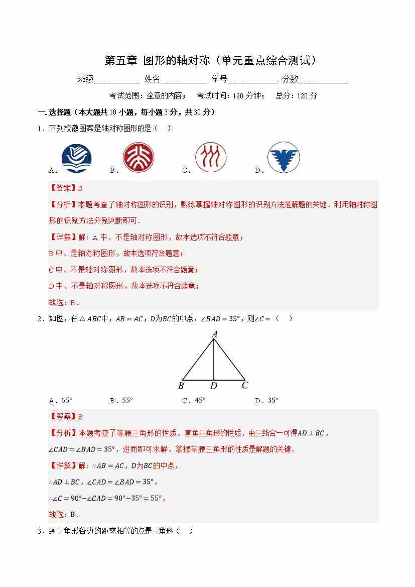 第五章 图形的轴对称(单元重点综合测试)(解析版)