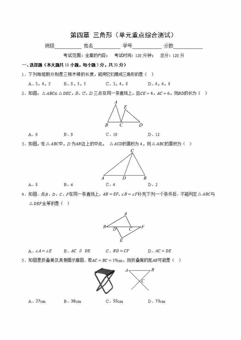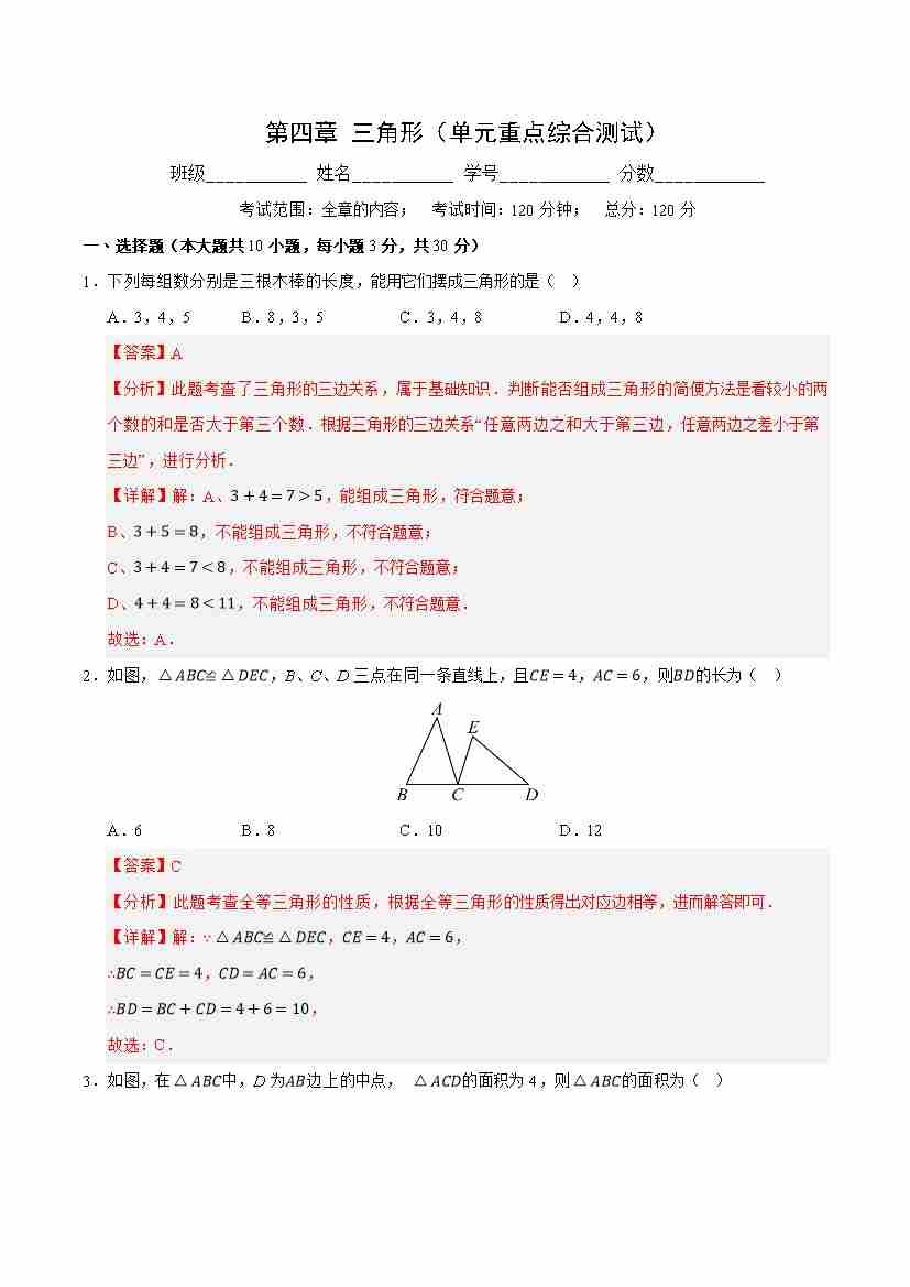 第四章 三角形(单元重点综合测试)(原卷版)