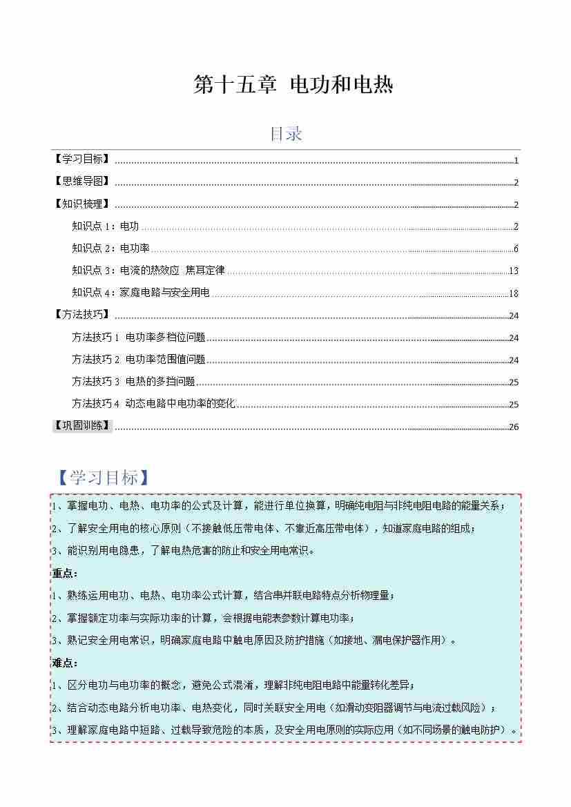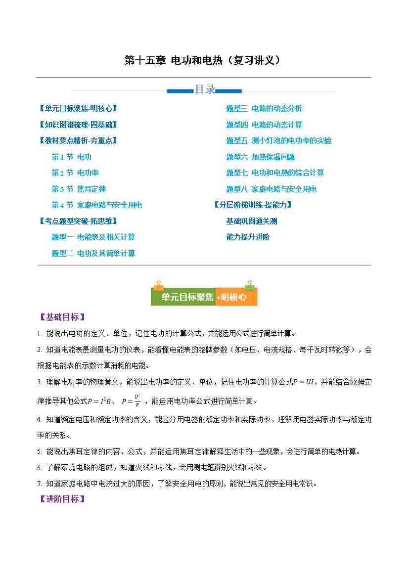 第十五章 电功和电热(复习讲义)(原卷版)