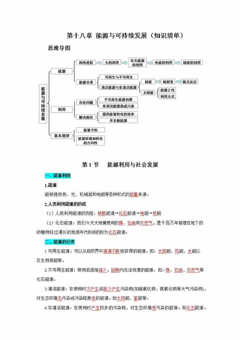 第十八章 能源与可持续发展(知识清单)(答案版)