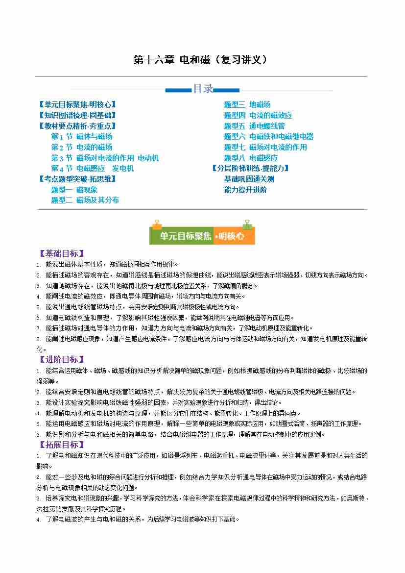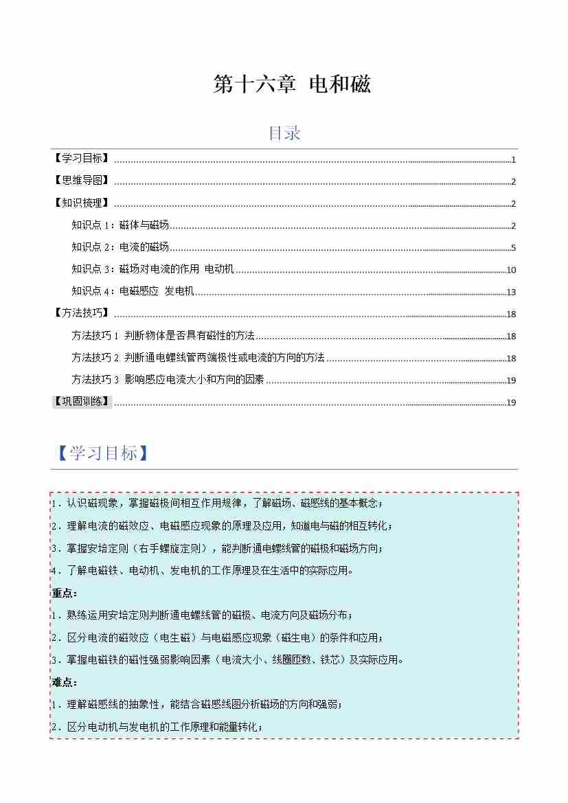第十六章 电和磁(复习讲义)(原卷版)