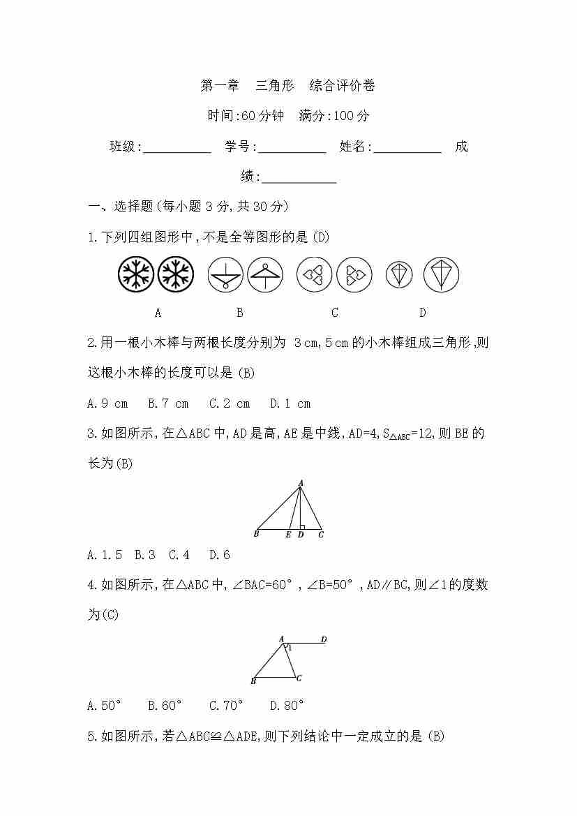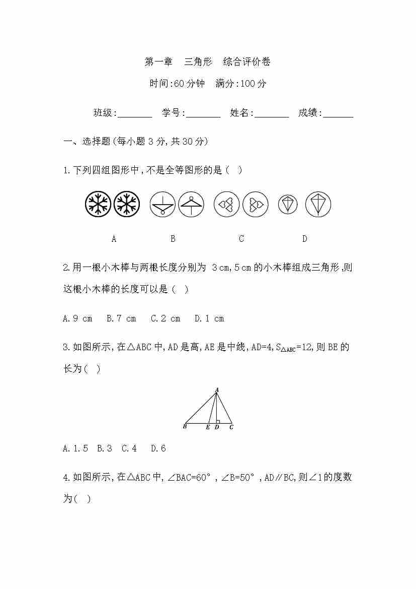 七上数学第1章 三角形测试·提升卷(考试版A4)