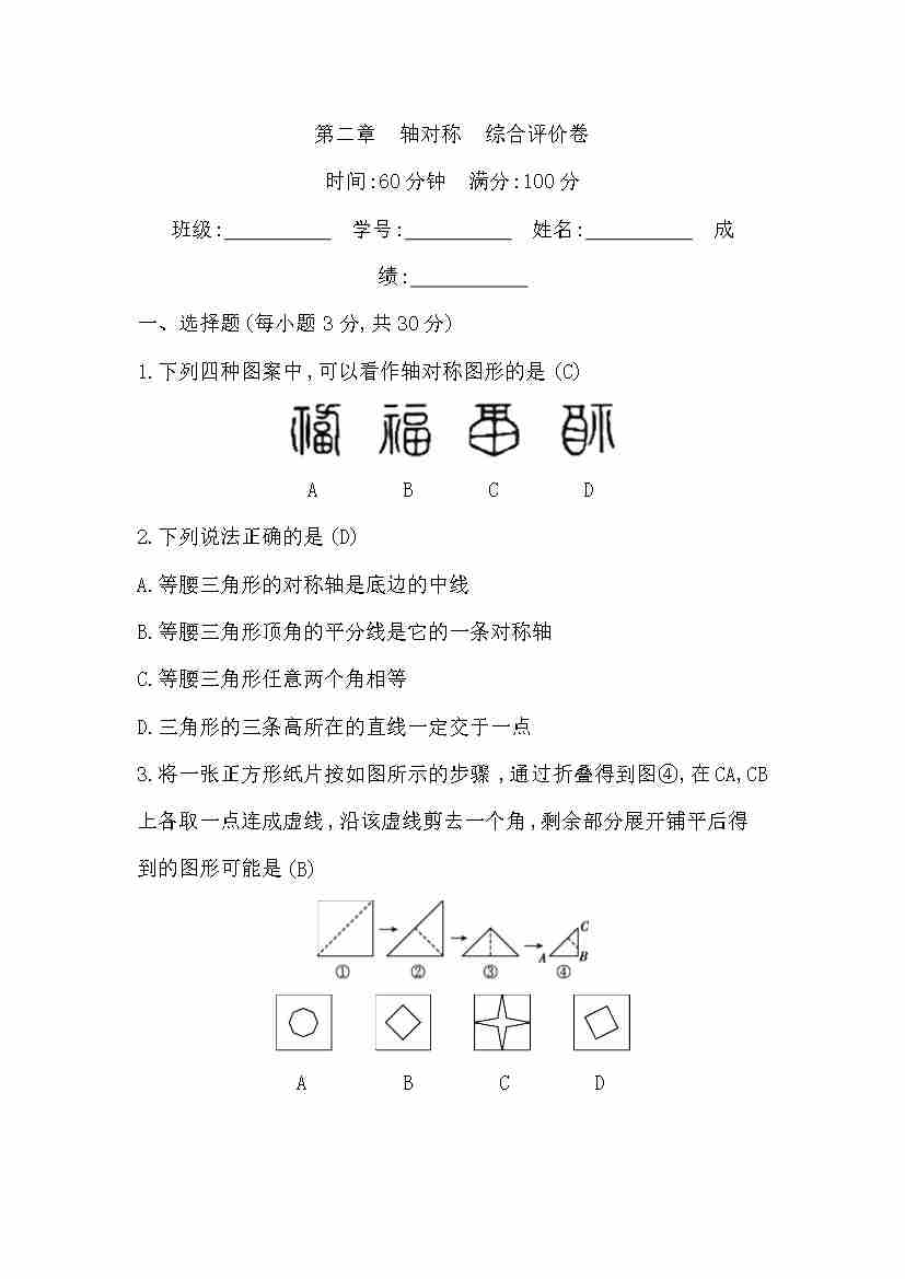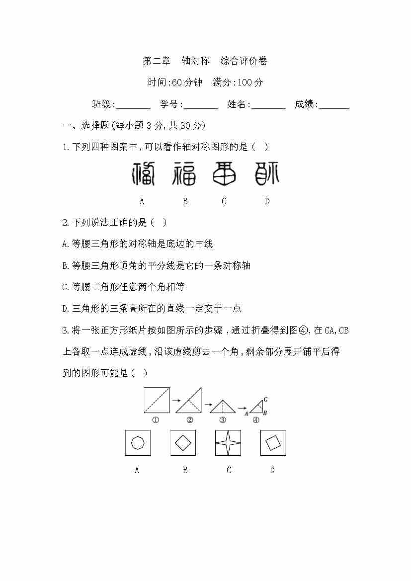 七上数学第2章 轴对称·提升卷(考试版A4)