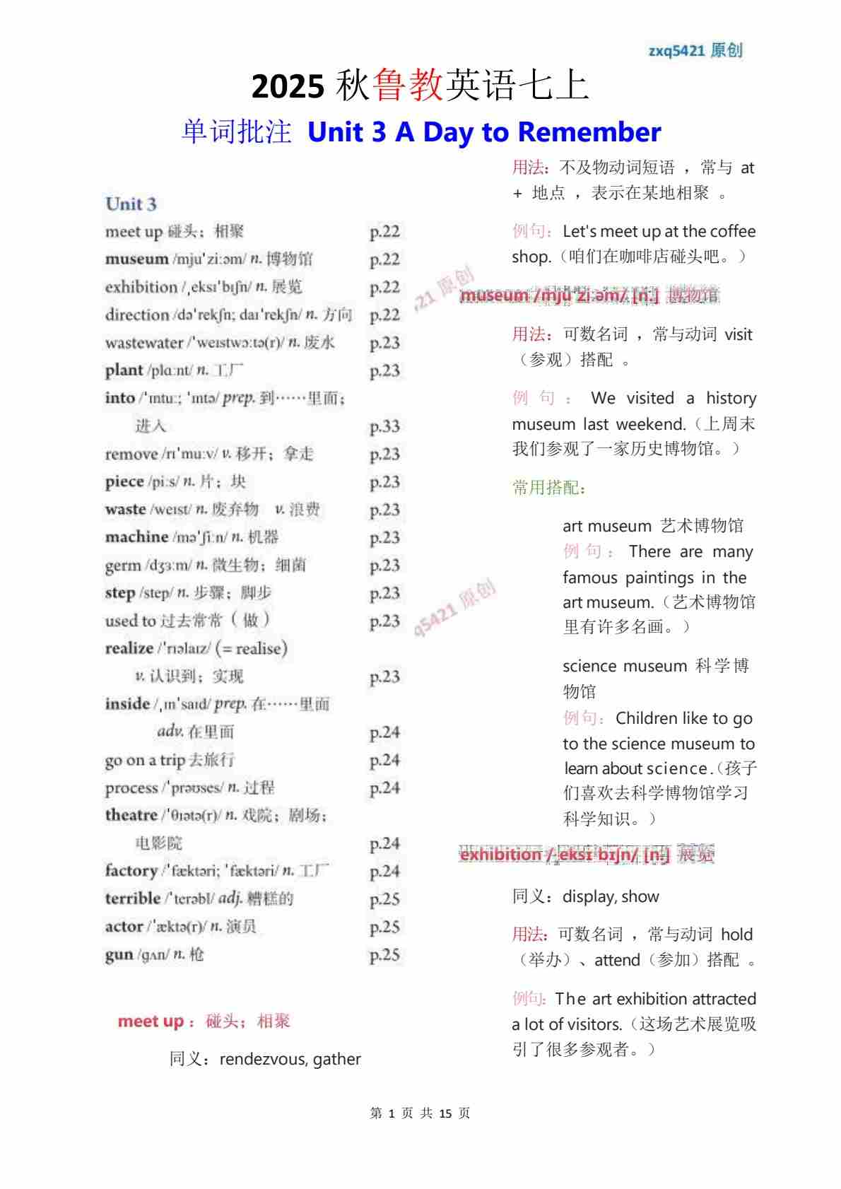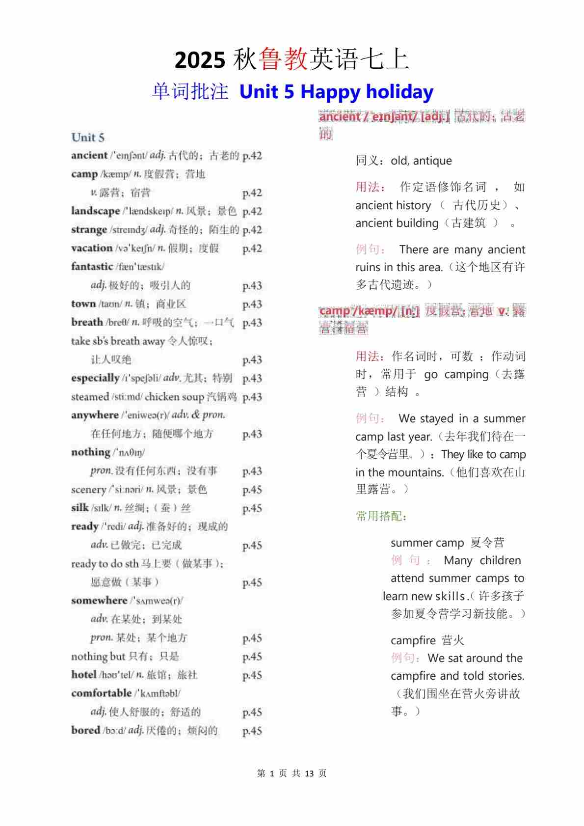 2025 秋鲁教版英语七上 单词批注 Unit 5
