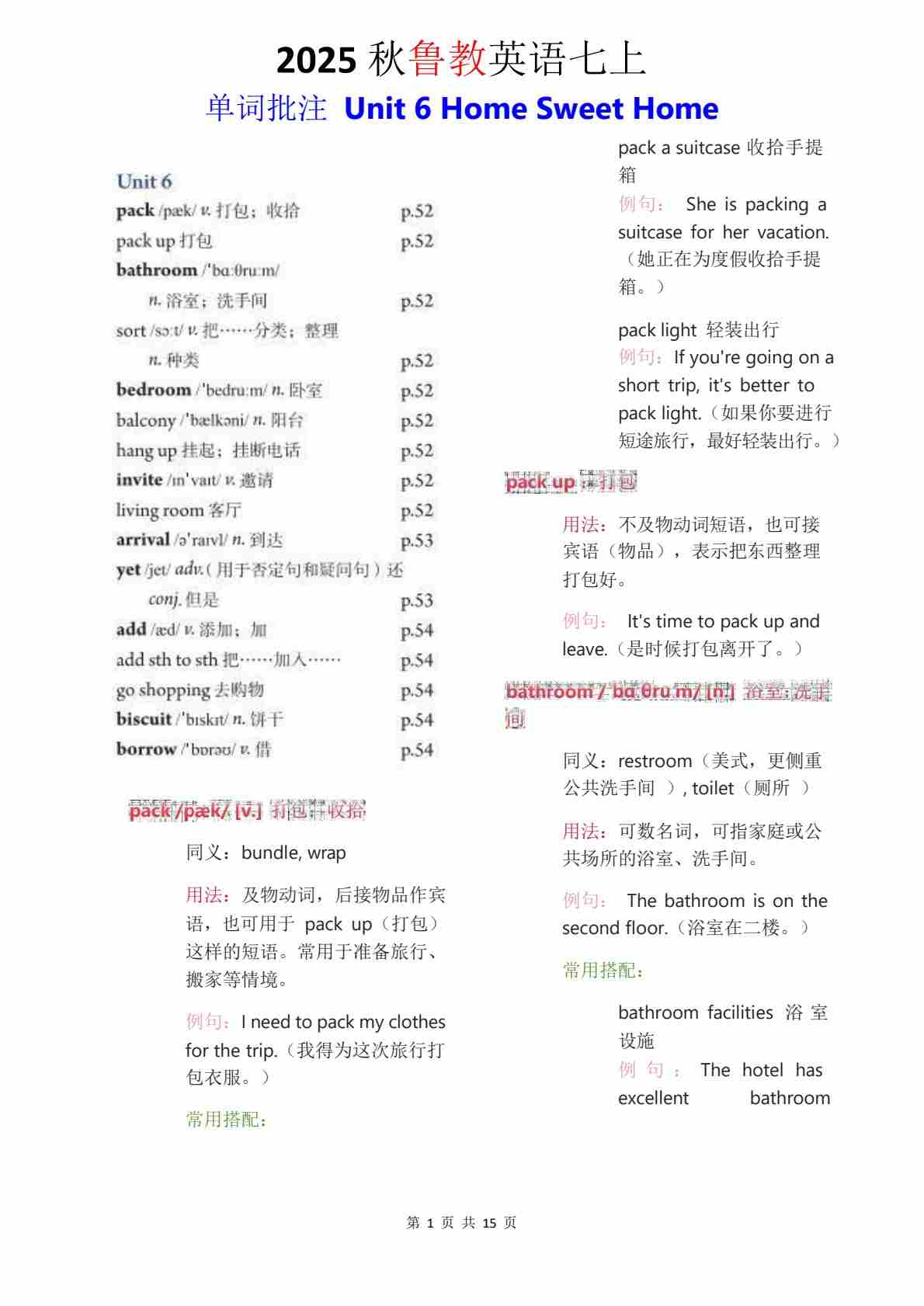 2025 秋鲁教版英语七上 单词批注 Unit 6
