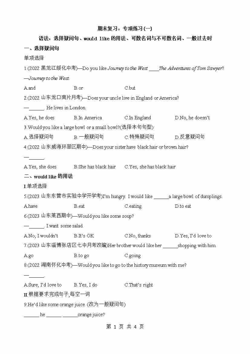 专项01 语法:选择疑问句、would like的用法、可数名词与不可数名词、一般过去时