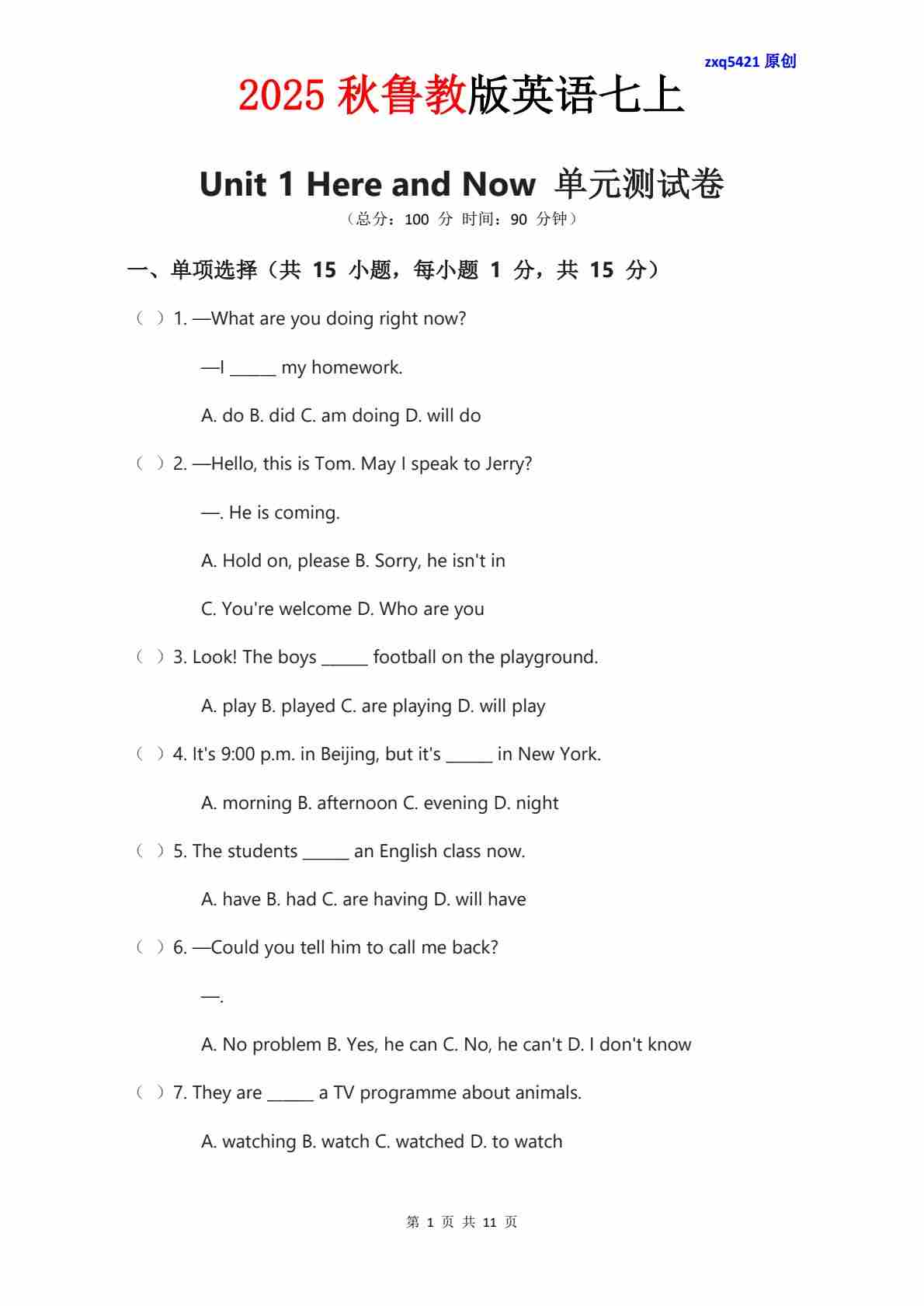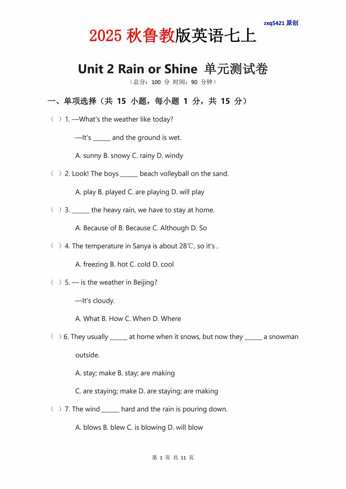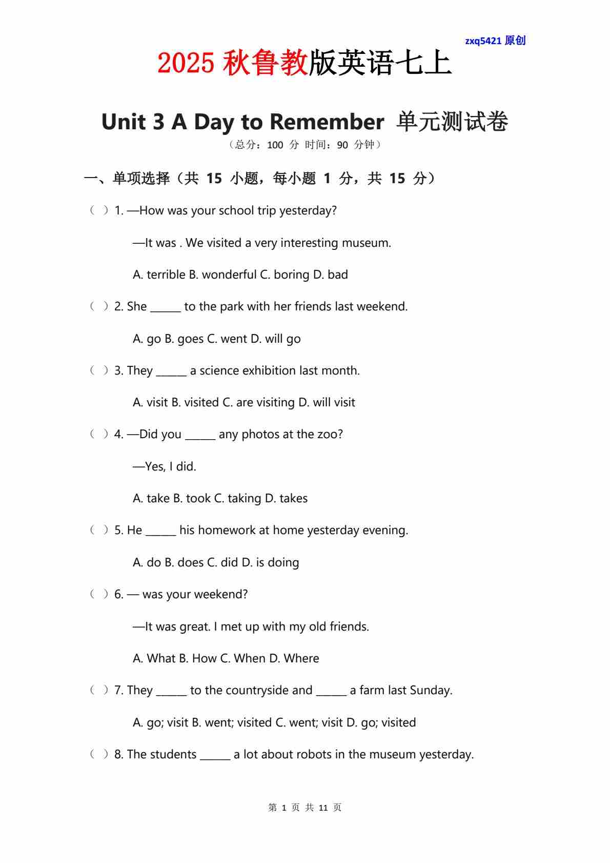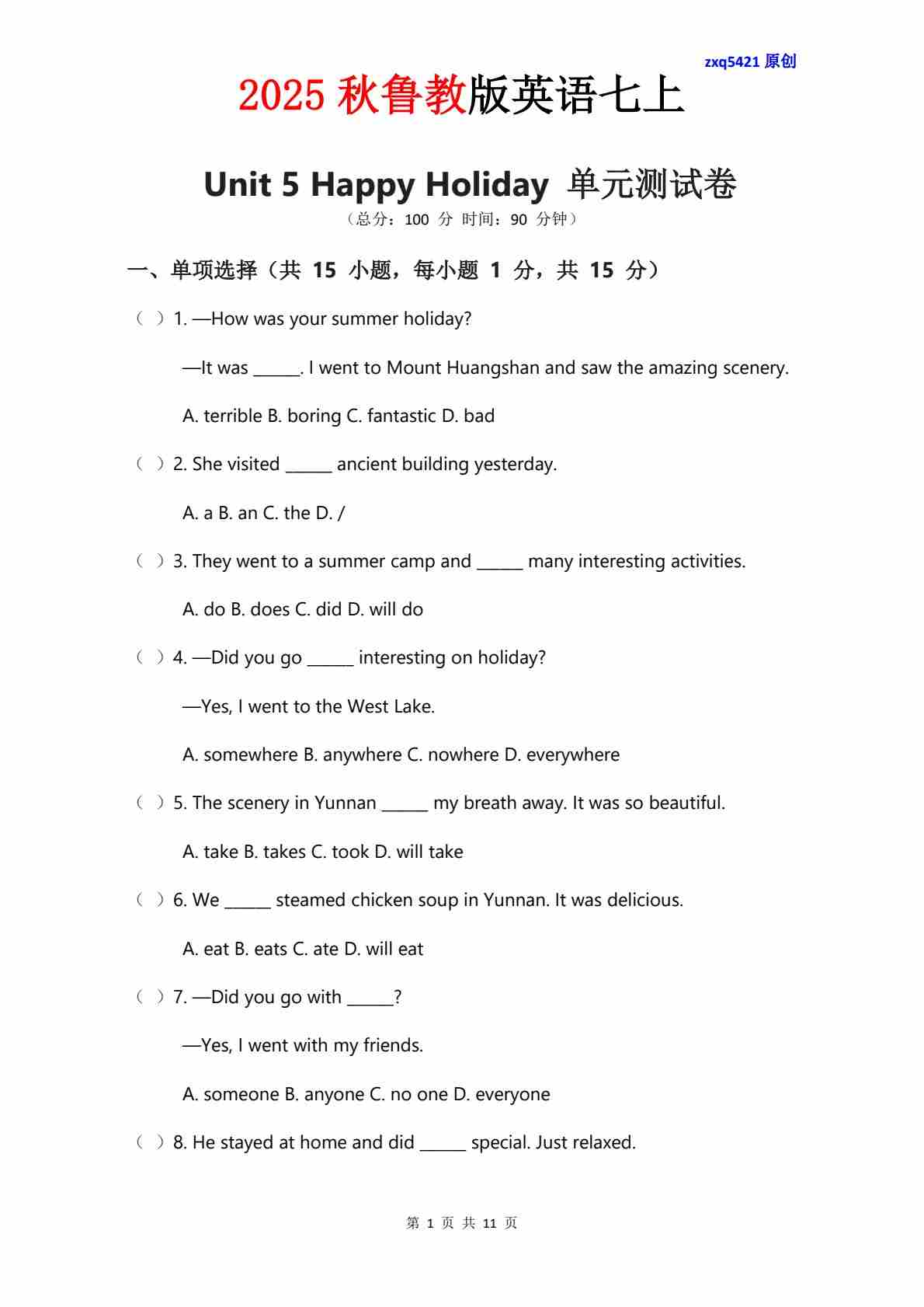 2025 秋鲁教版七上 单元测试卷Unit 5