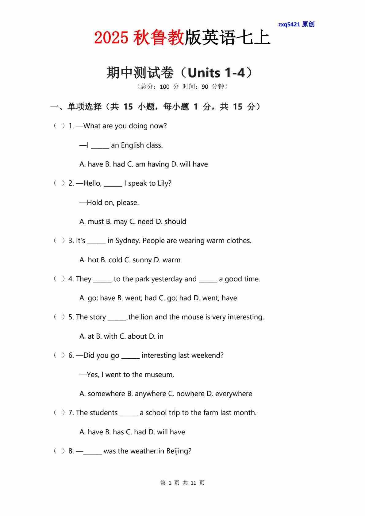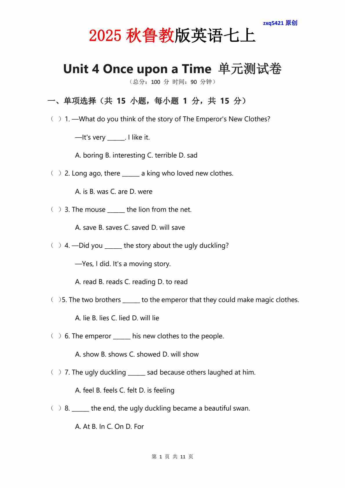 2025 秋鲁教版七上 单元测试卷Unit 4