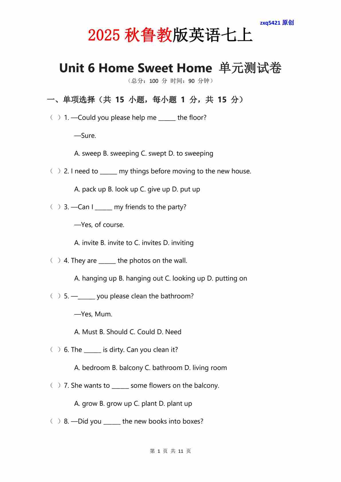 2025 秋鲁教版七上 单元测试卷Unit 6