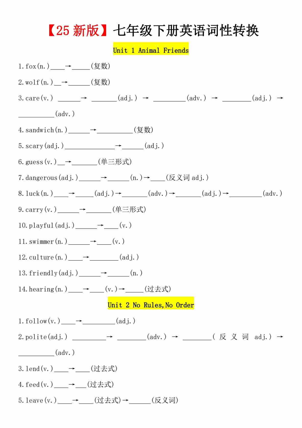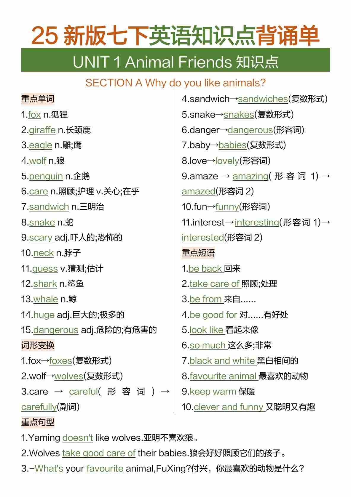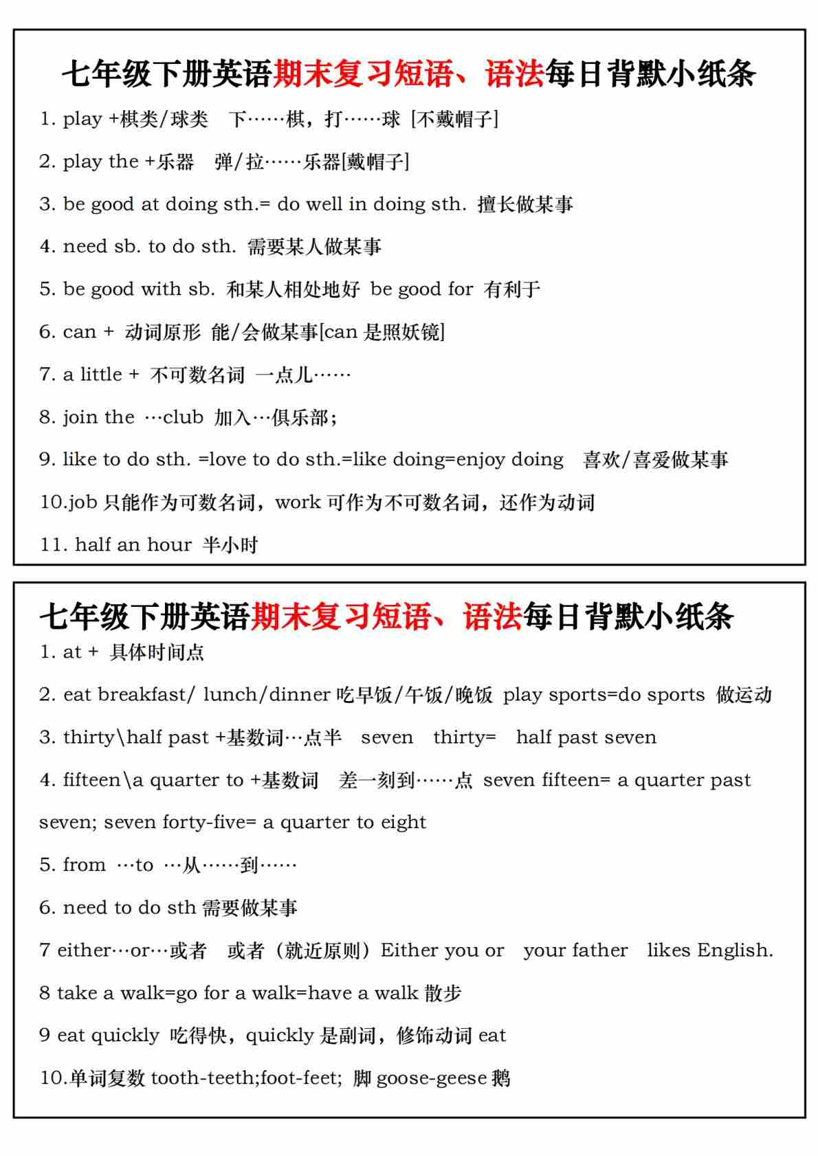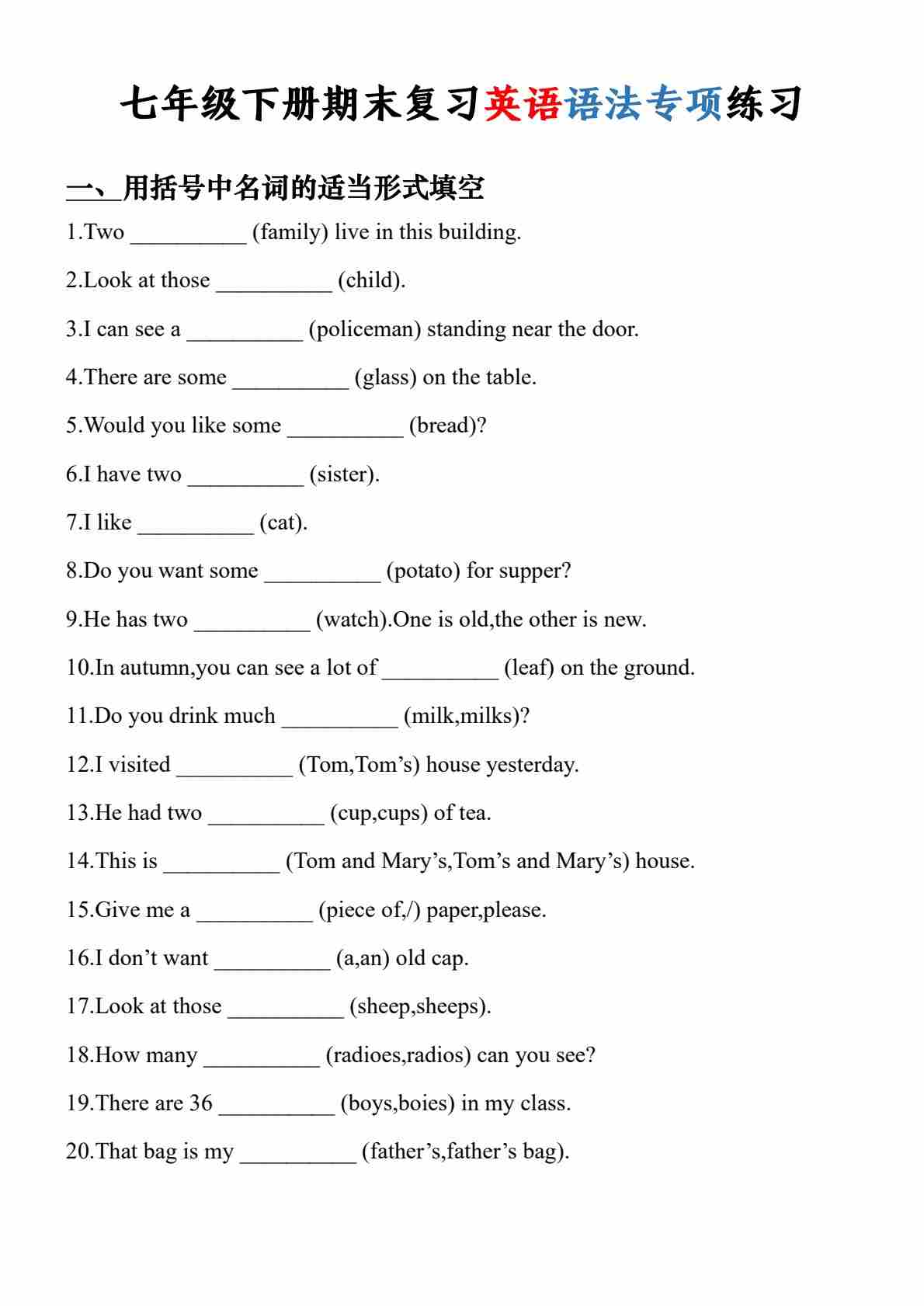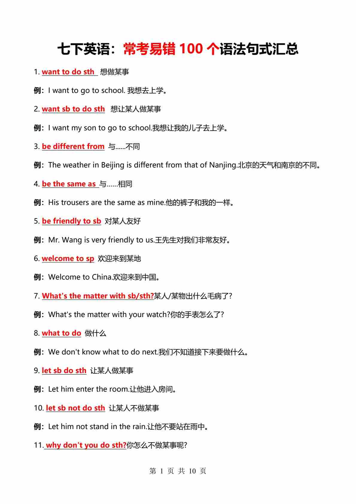 七下英语: 常考易错 100 个语法句式专项练习 - 副本