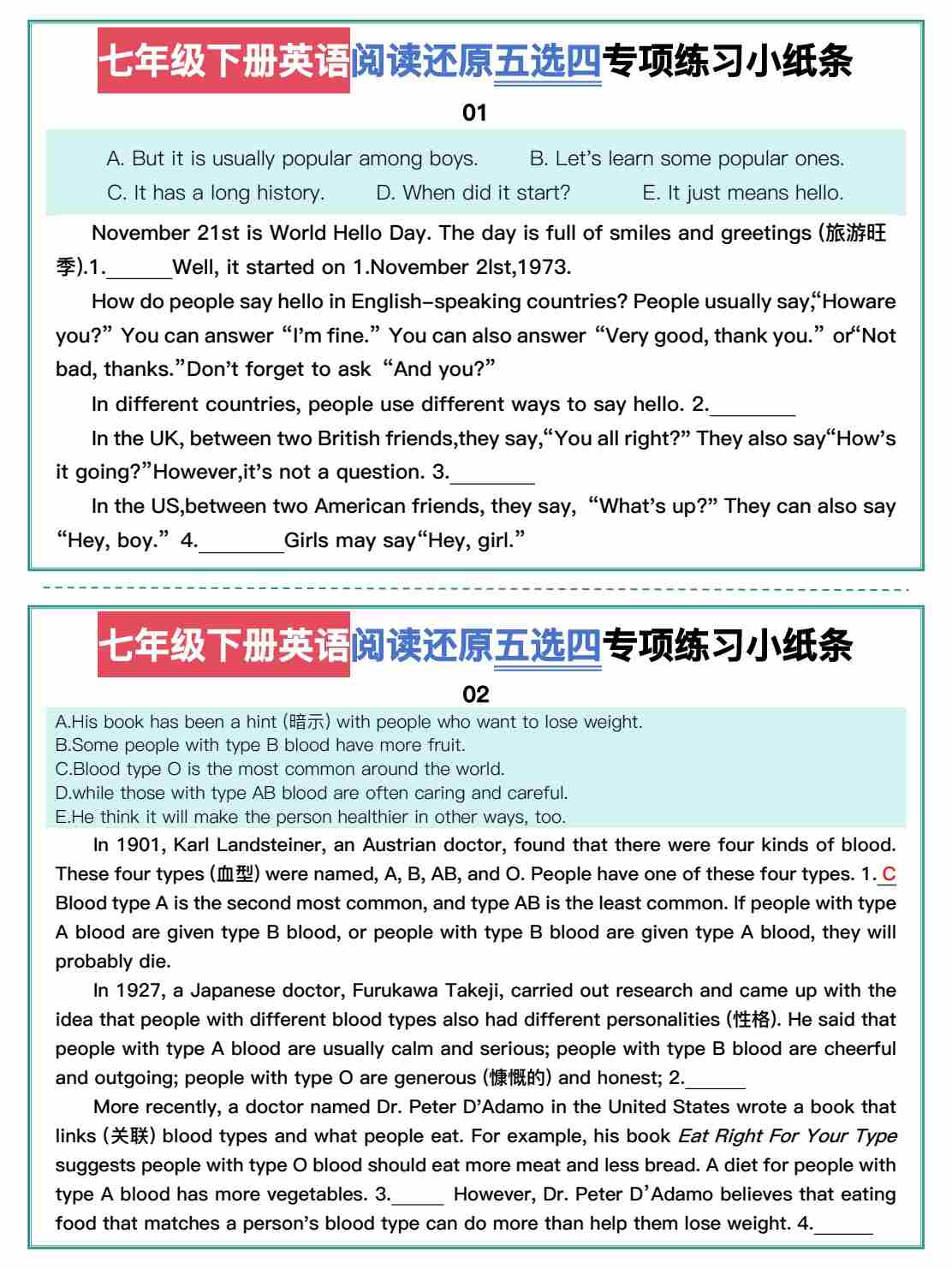 七年级下册英语阅读还原五选四专项练习小纸条(1)