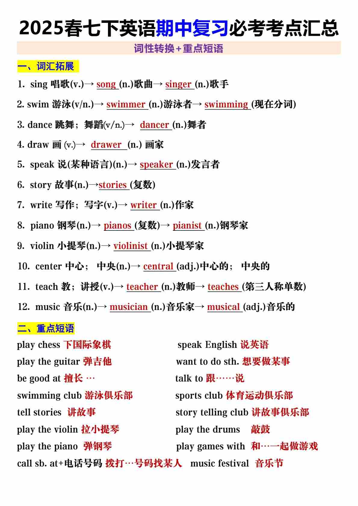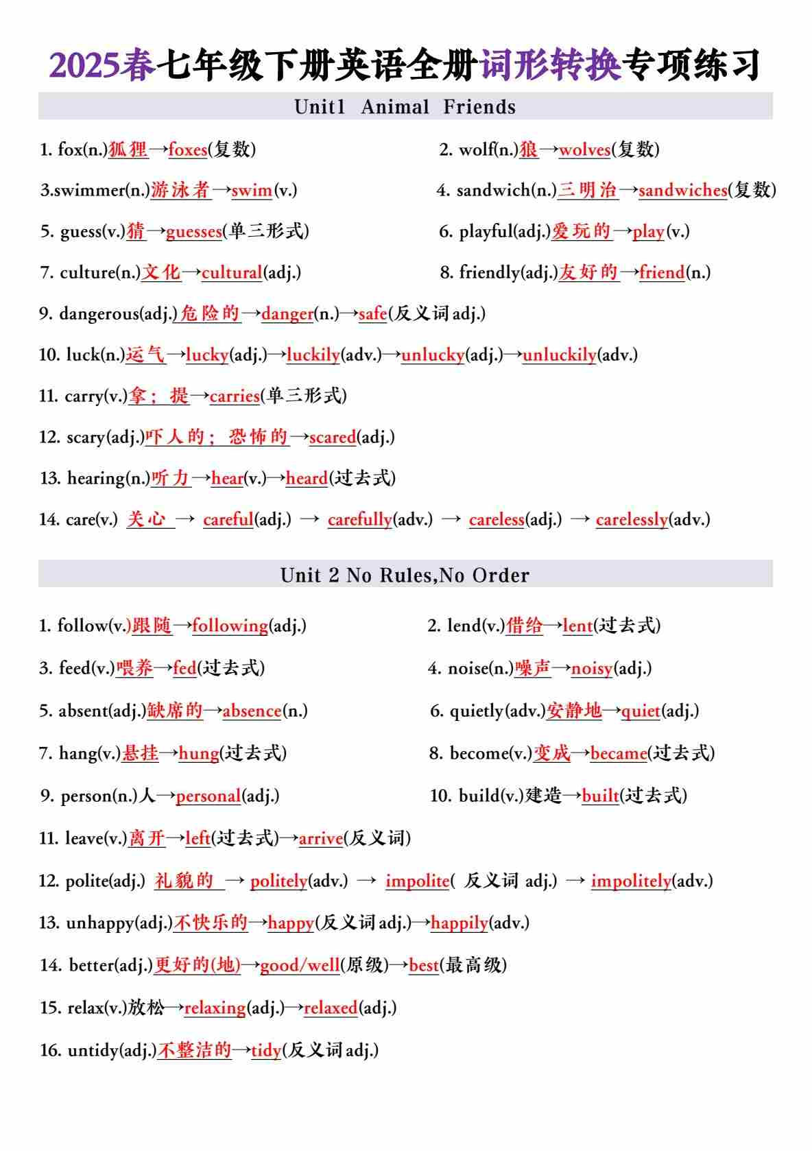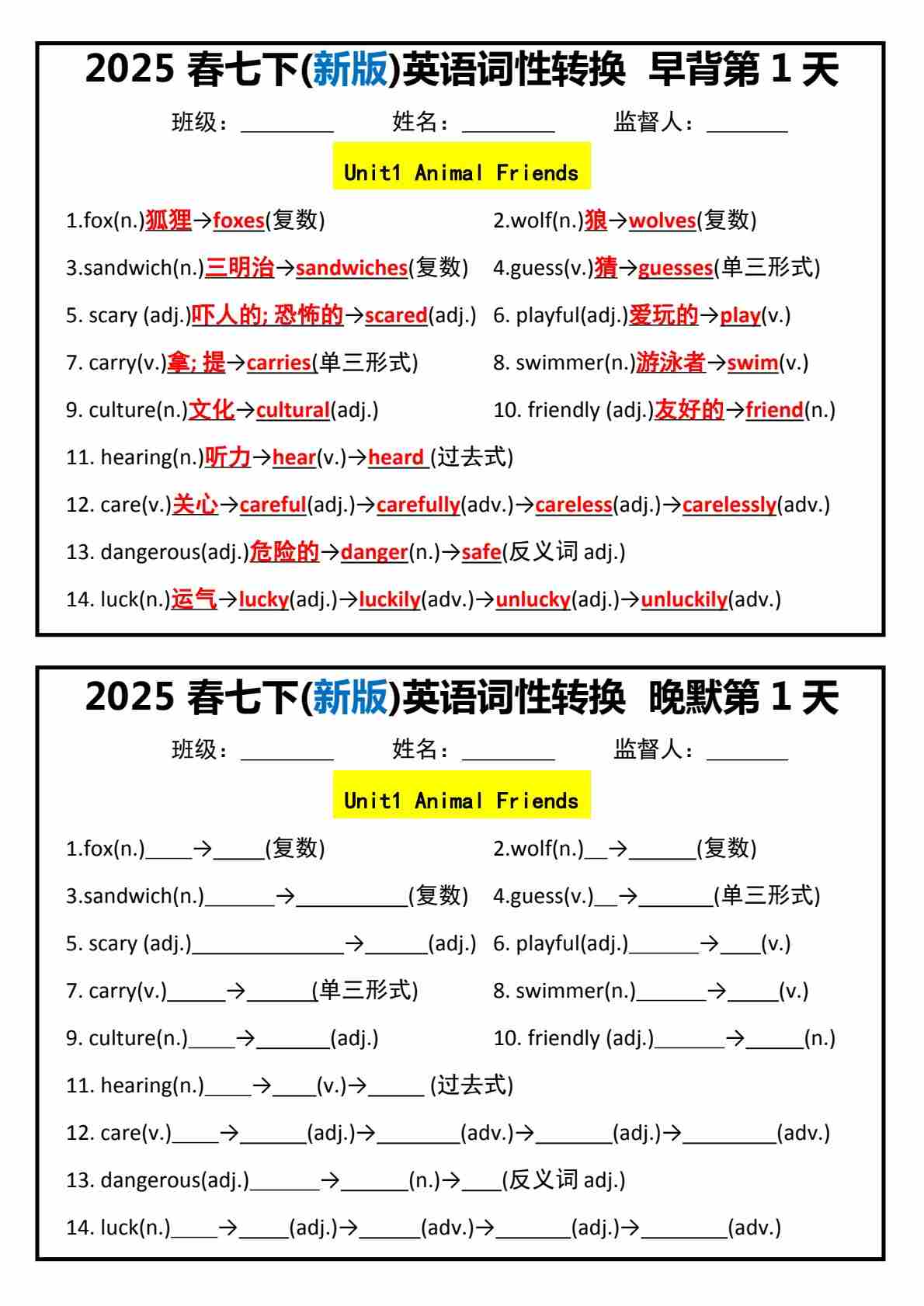 2025 春七下(新版)英语词性转换早背晚默小纸条