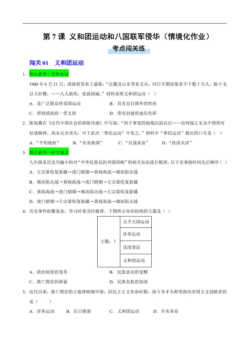 第7课 义和团运动和八国联军侵华(情境化作业)(原卷版).