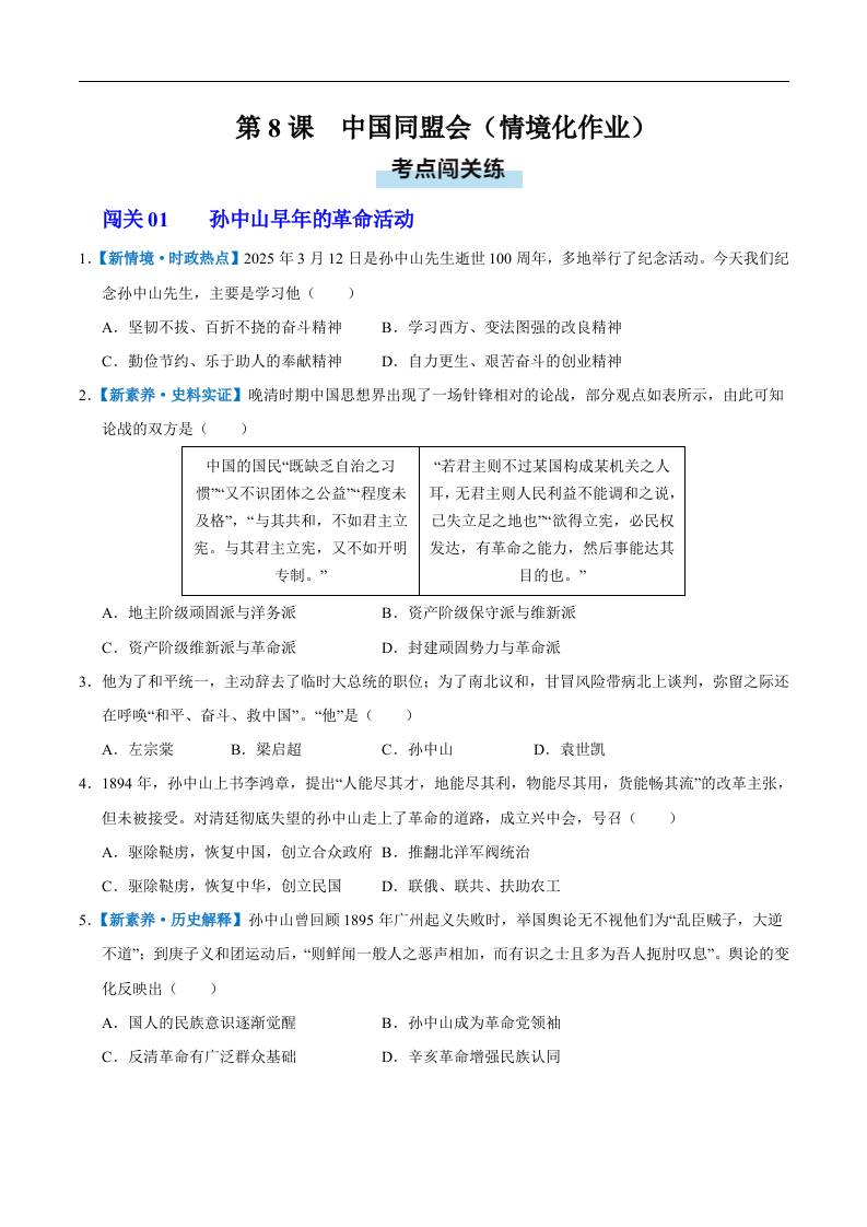 第8课 中国同盟会(情境化作业)(原卷版).