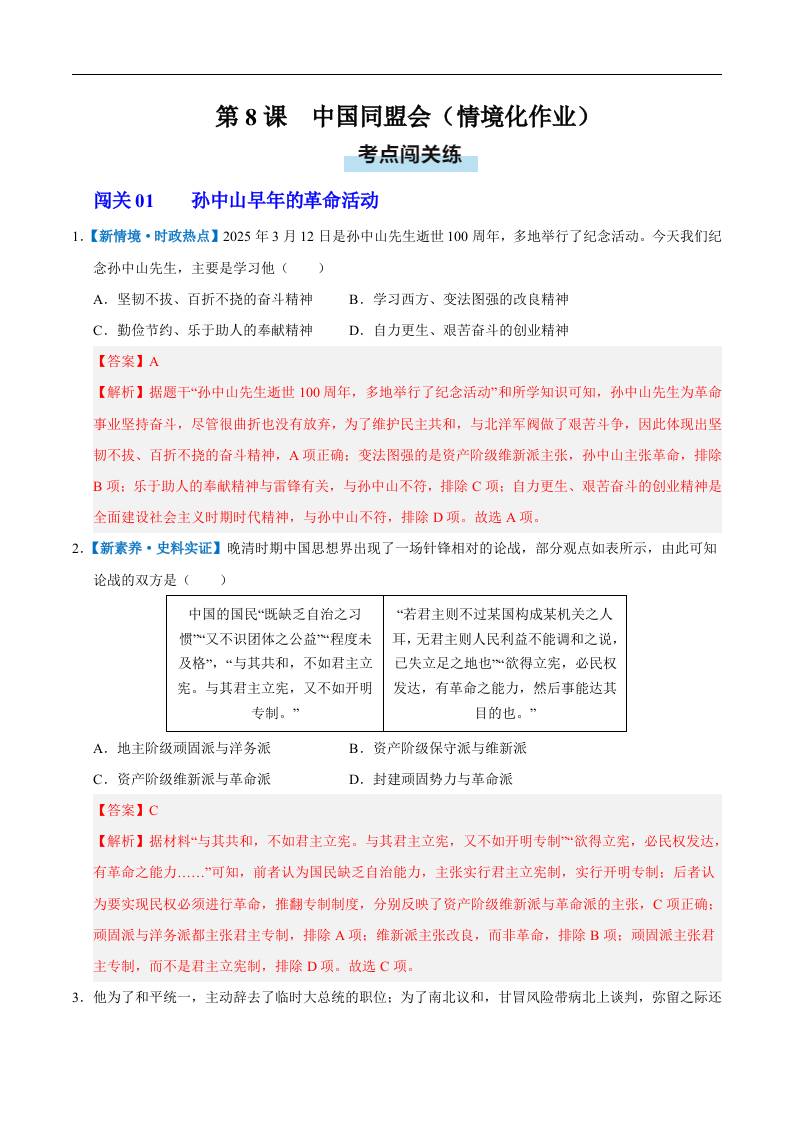 第8课 中国同盟会(情境化作业)(解析版).