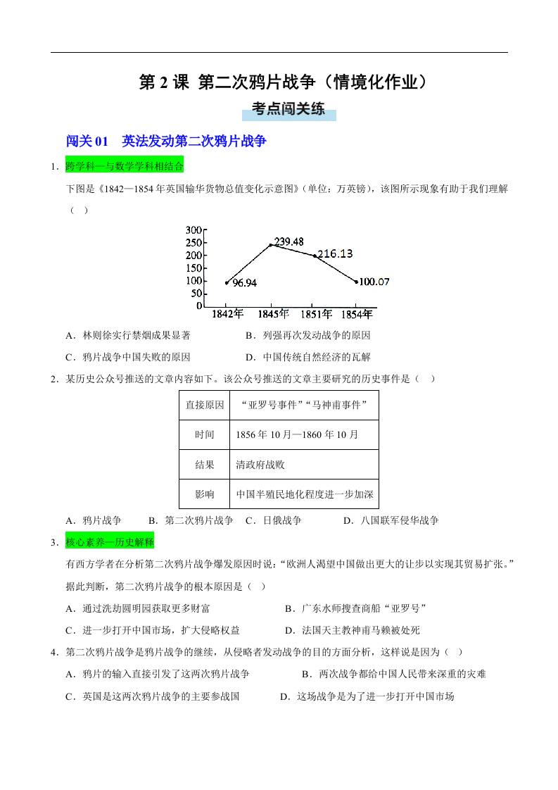第2课 第二次鸦片战争(情境化作业)(原卷版)..