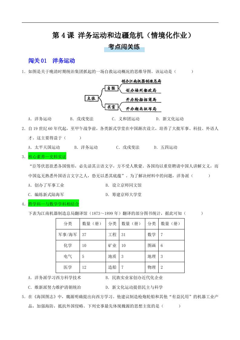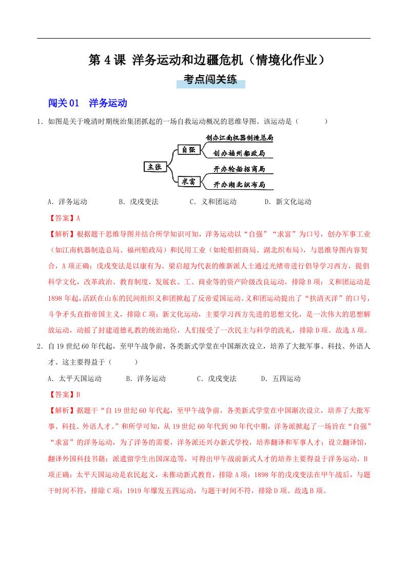 第4课 洋务运动和边疆危机(情境化作业)(解析版)..