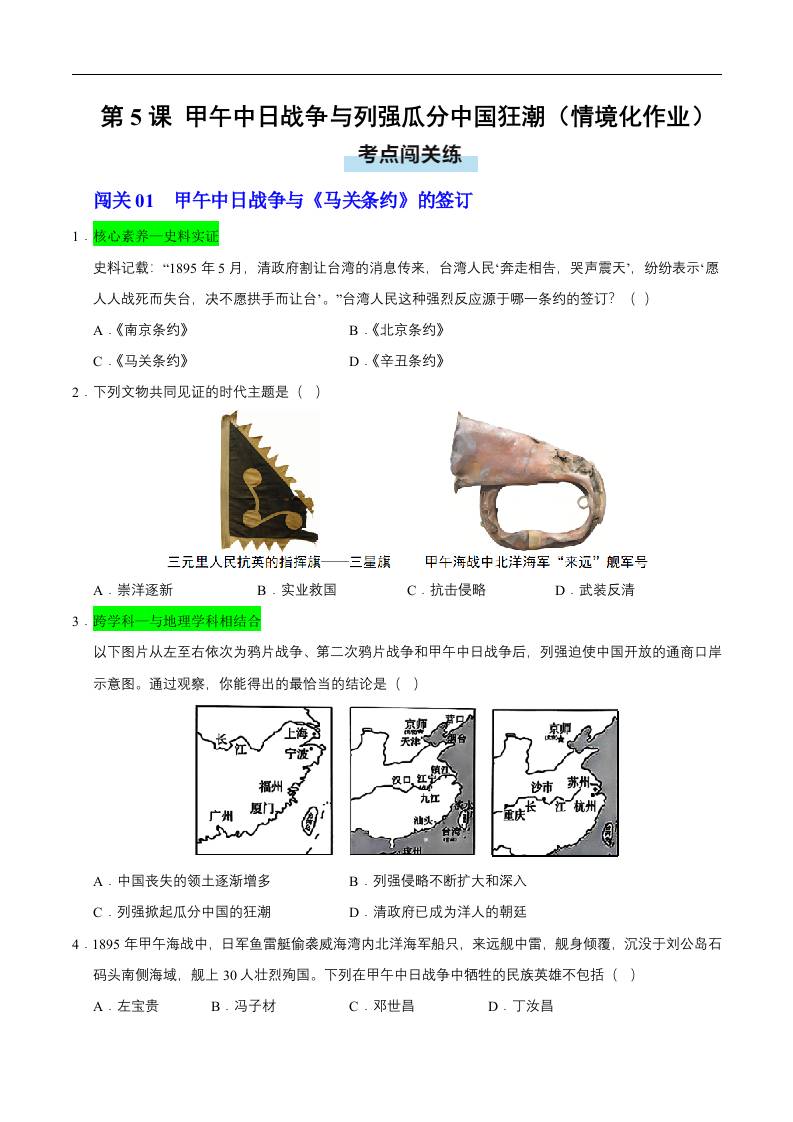 第5课 甲午中日战争与列强瓜分中国狂潮(情境化作业)(原卷版).