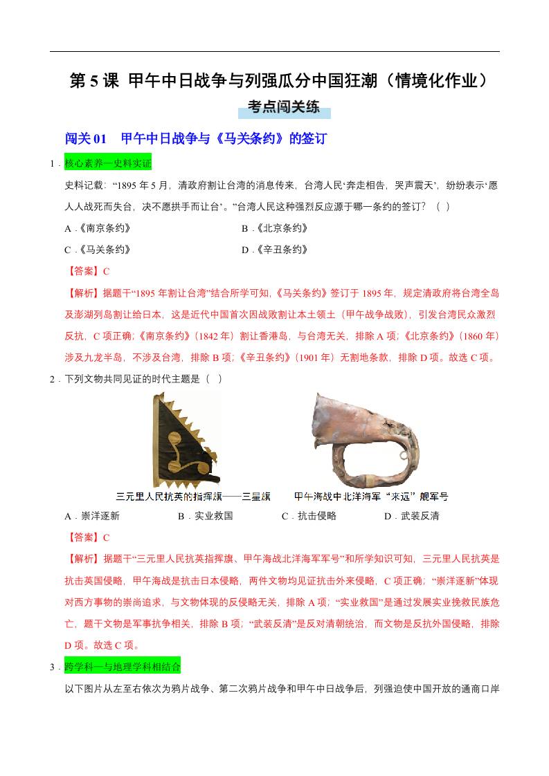 第5课 甲午中日战争与列强瓜分中国狂潮(情境化作业)(解析版).