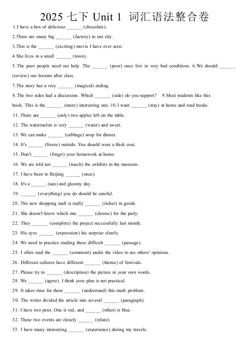 2025七下Unit 1 词汇语法整合卷