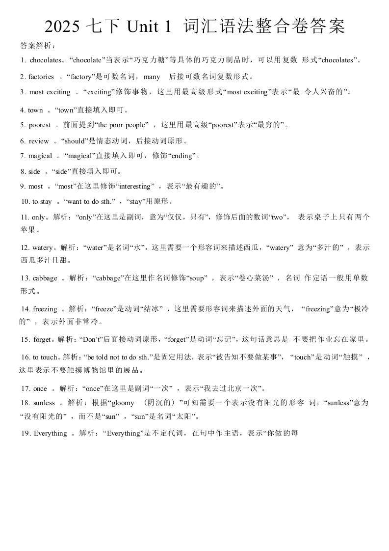 2025七下Unit 1 词汇语法整合卷答案