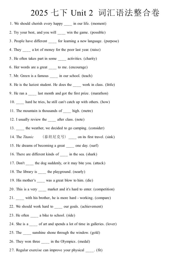 [21790607]2025春外研版七年级英语下册用所给词的适当形式填空专练Unit 2 Go for it!(含答案解析)