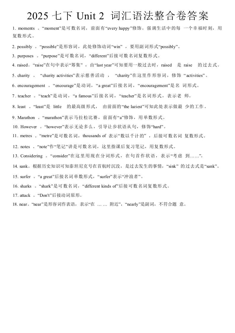 2025七下Unit 2 词汇语法整合卷答案