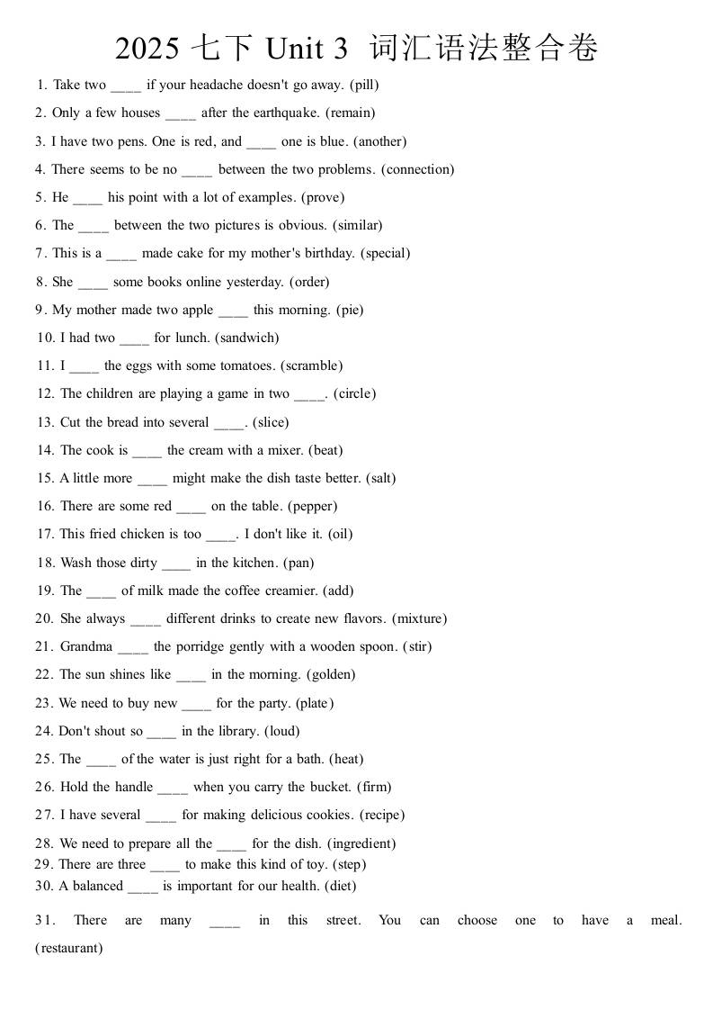 2025七下Unit 3 词汇语法整合卷