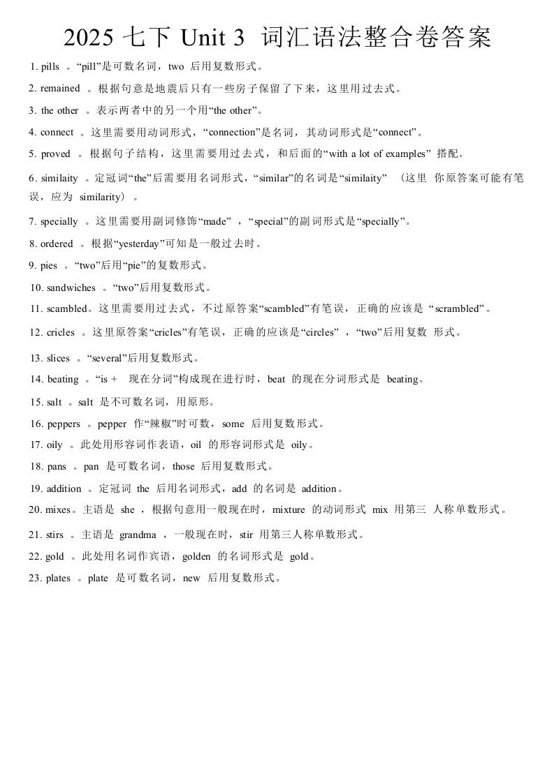 2025七下Unit 3 词汇语法整合卷答案