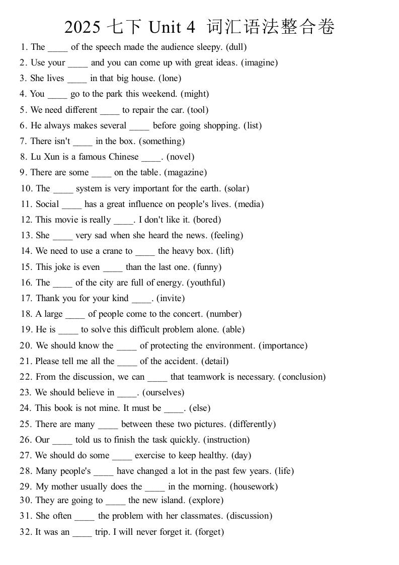 2025七下Unit 4 词汇语法整合卷