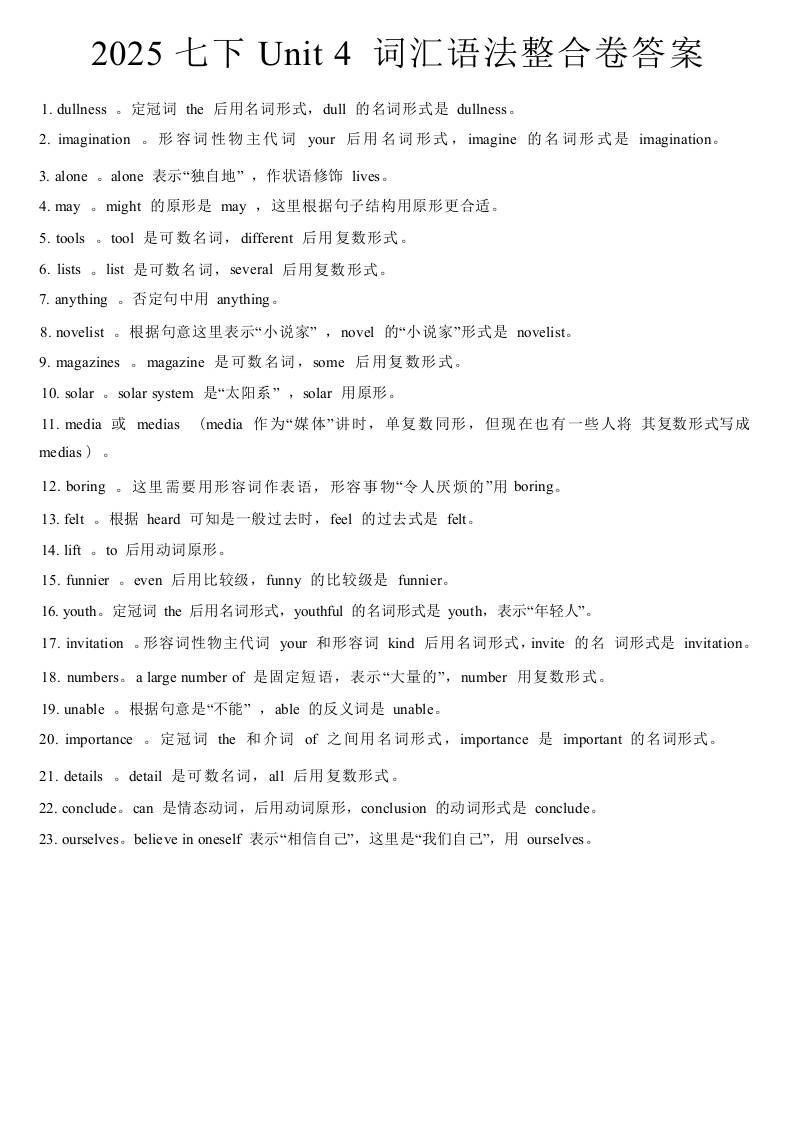 2025七下Unit 4 词汇语法整合卷答案