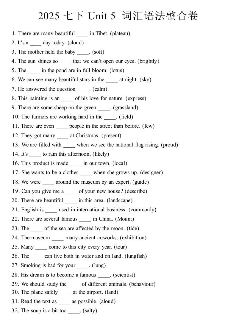 2025七下Unit 5 词汇语法整合卷