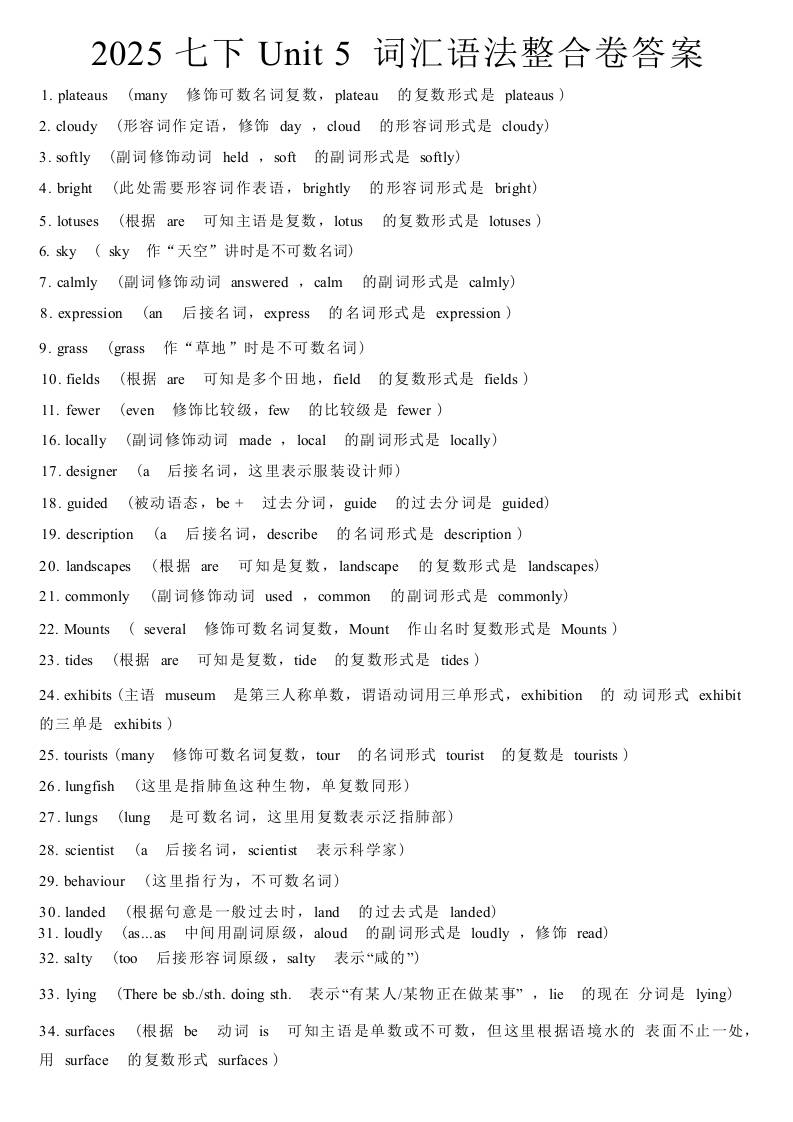 2025七下Unit 5 词汇语法整合卷答案