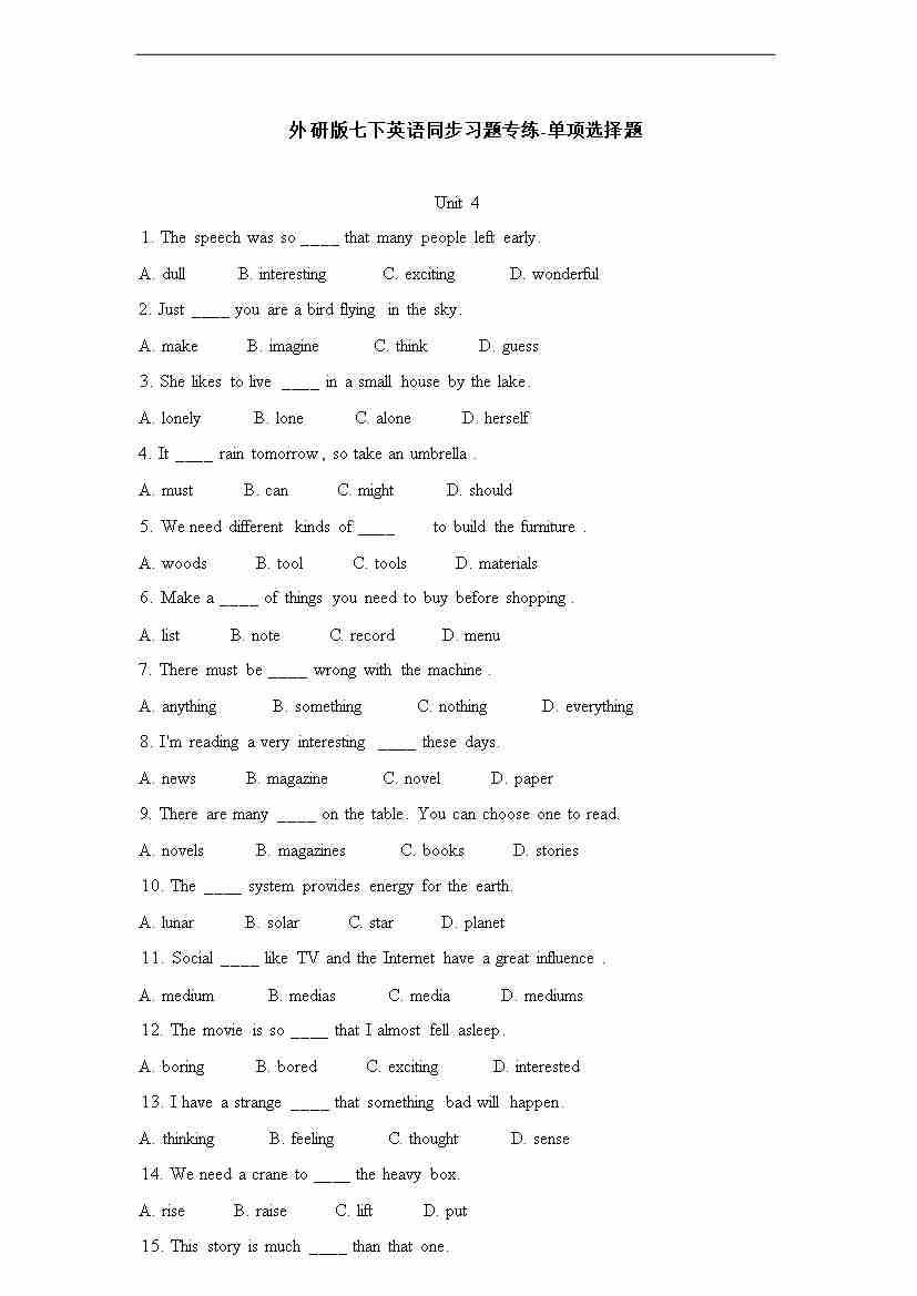 [21790617]2025春外研版七年级英语下册单项选择题专练Unit 4 The art of having fun(含答案解析)