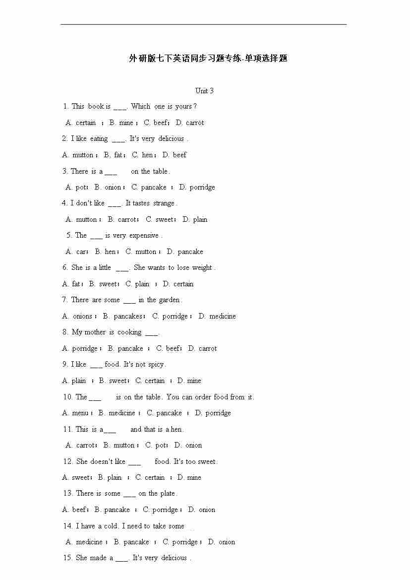 [21790619]2025春外研版七年级英语下册单项选择题专练Unit 3 Food matters(含答案解析)