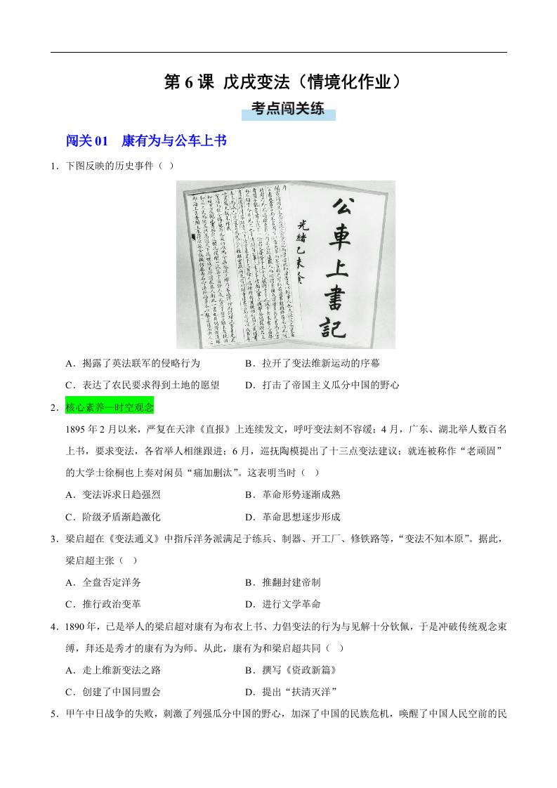 第6课 戊戌变法(情境化作业)(原卷版).