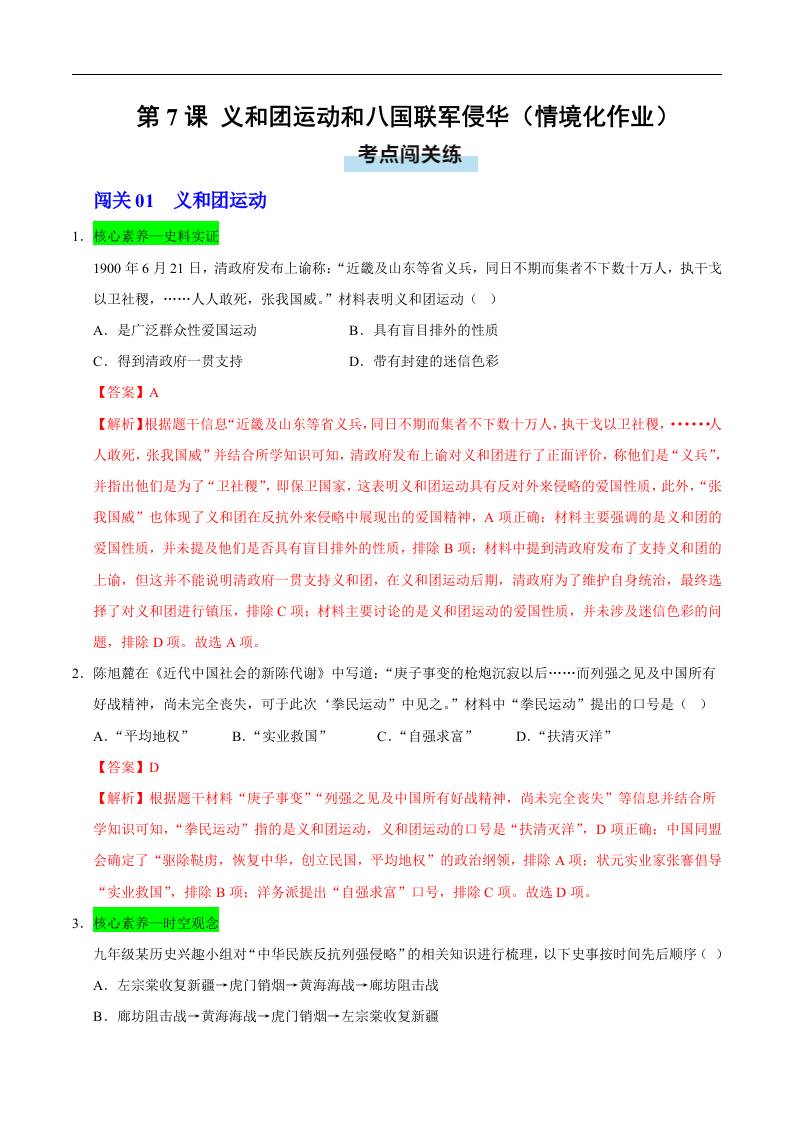 第7课 义和团运动和八国联军侵华(情境化作业)(解析版).