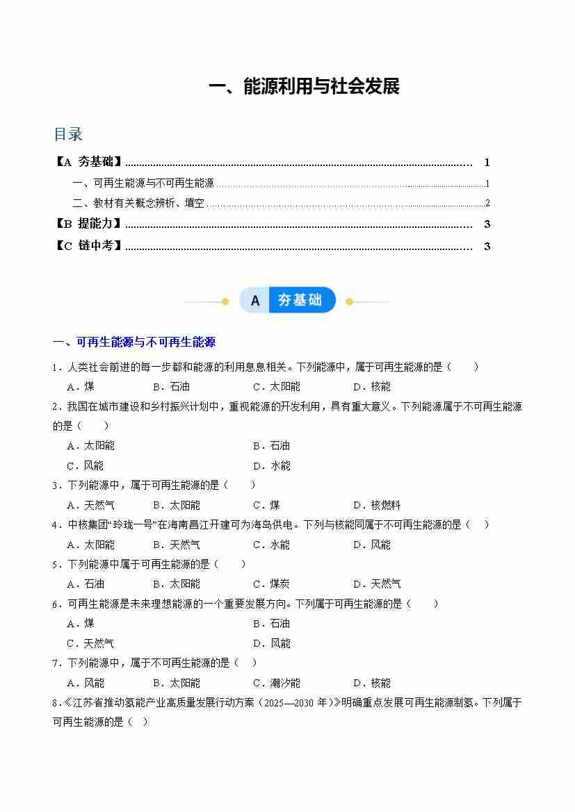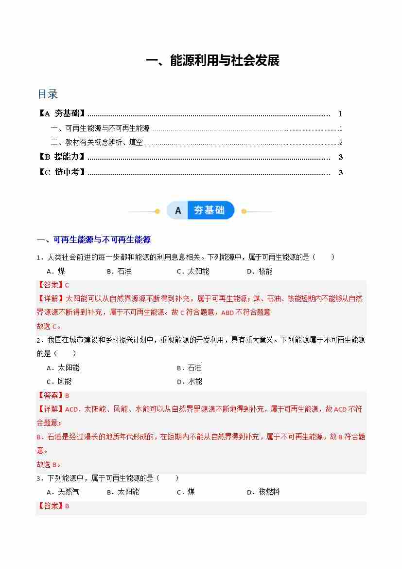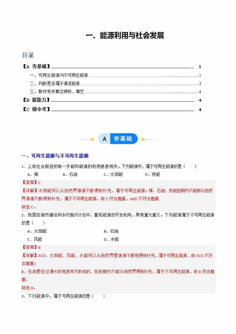 一、能源利用与社会发展(分层作业)(解析版)(1)