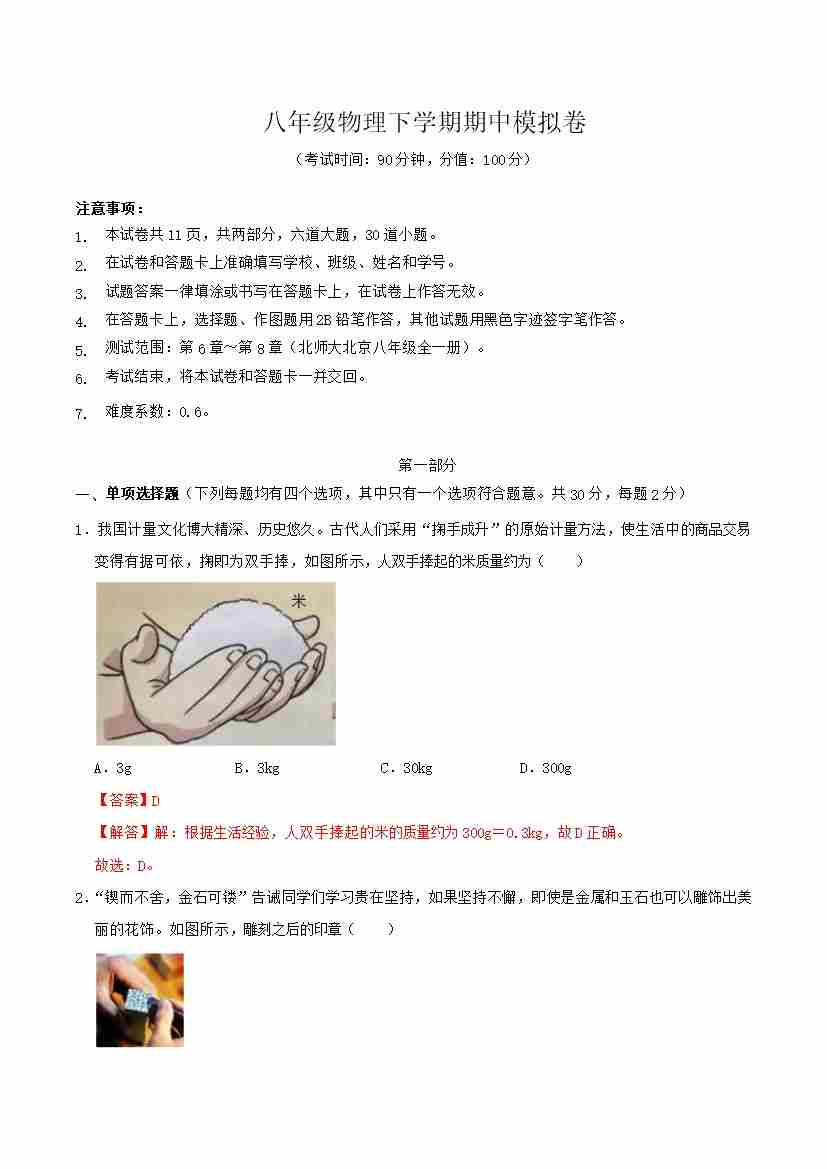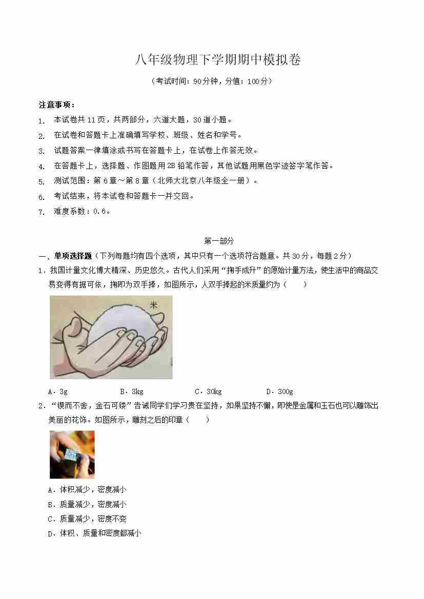 八年级物理期中模拟卷【测试范围:第6~8章】(考试版)(北师大(北京)专用)