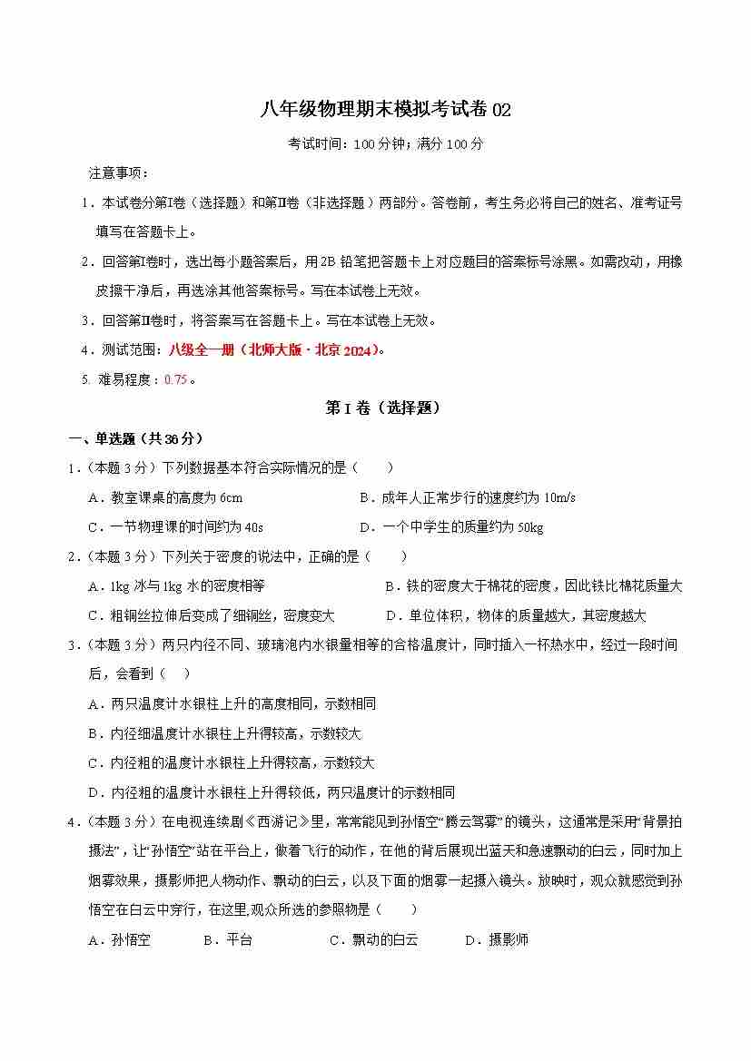 八年级物理期末模拟考试卷02.原卷版docx