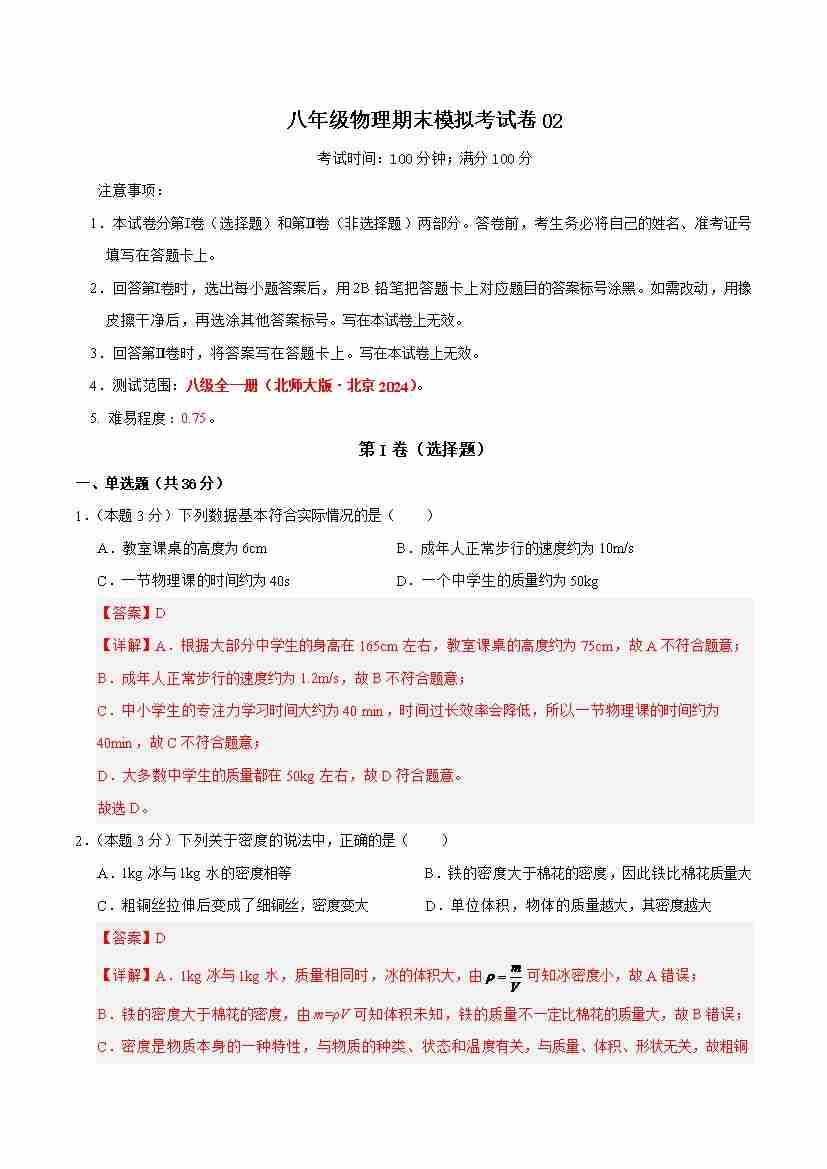 八年级物理期末模拟考试卷02.解析版docx