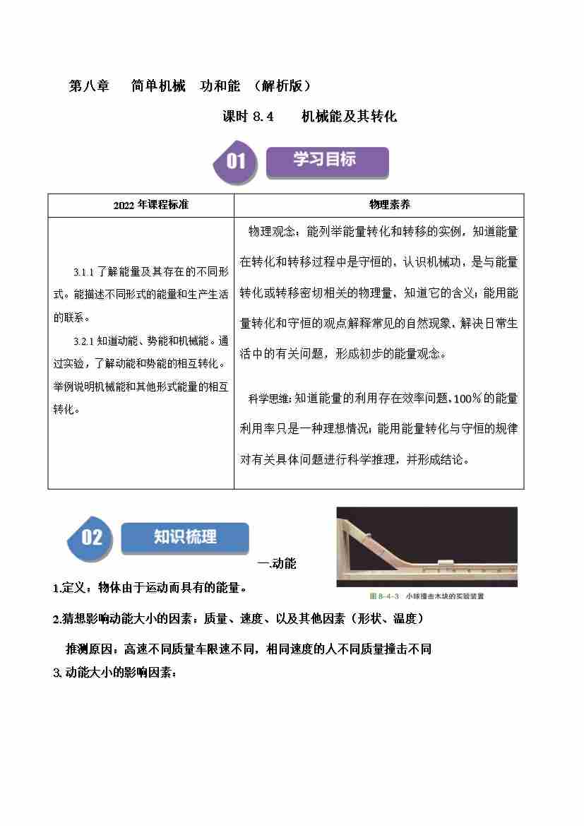 课时8.4机械能及其转化(学生版)-( 沪科版五四制2024)