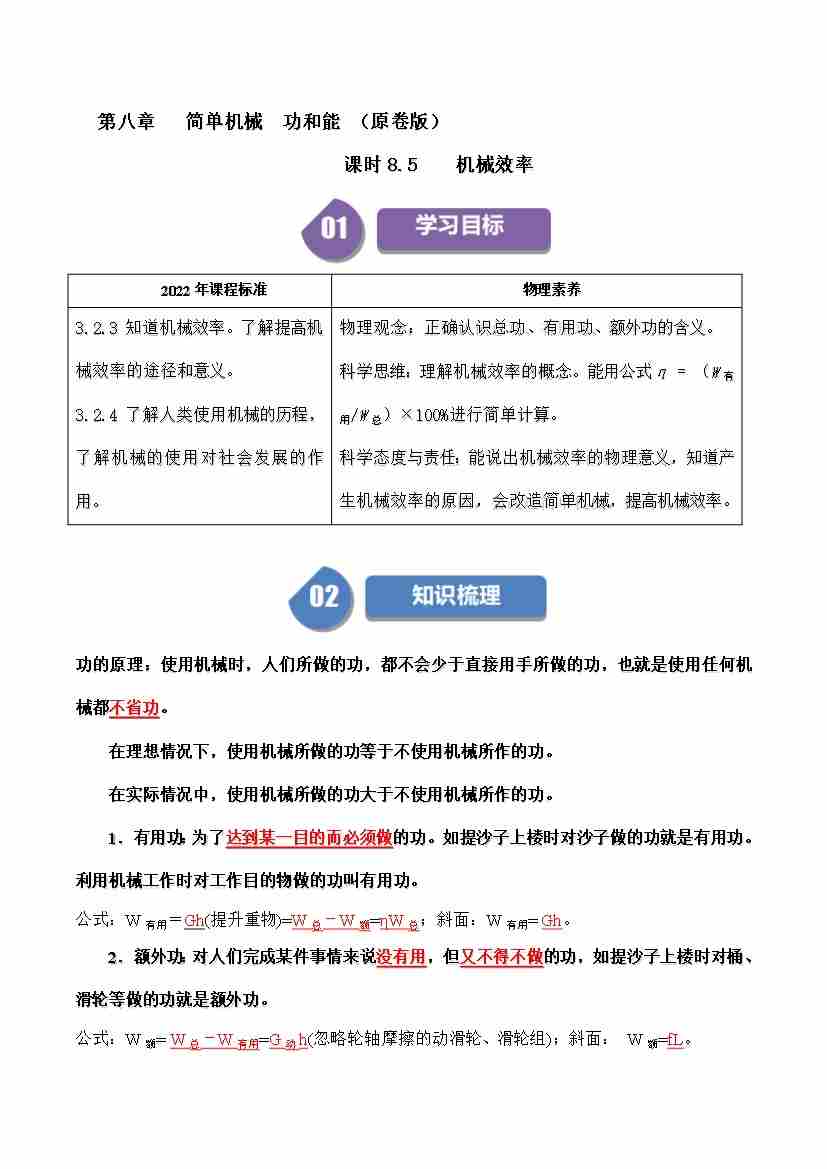 课时8.5机械效率(学生版)-( 沪科版五四制2024)