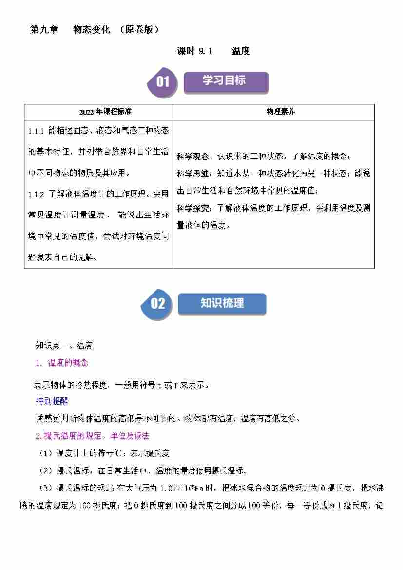 课时9.1温度(学生版)-( 沪科版五四制2024)