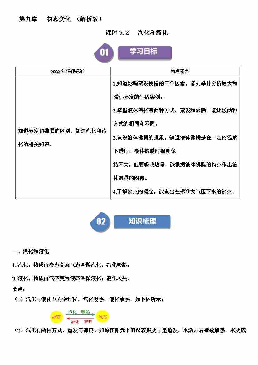 课时9.2汽化和液化(学生版)-( 沪科版五四制2024)