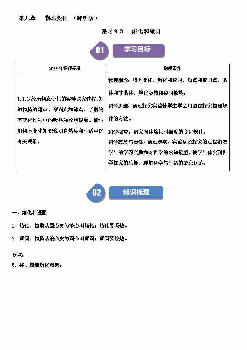 课时9.3熔化和凝固(学生版)-( 沪科版五四制2024)