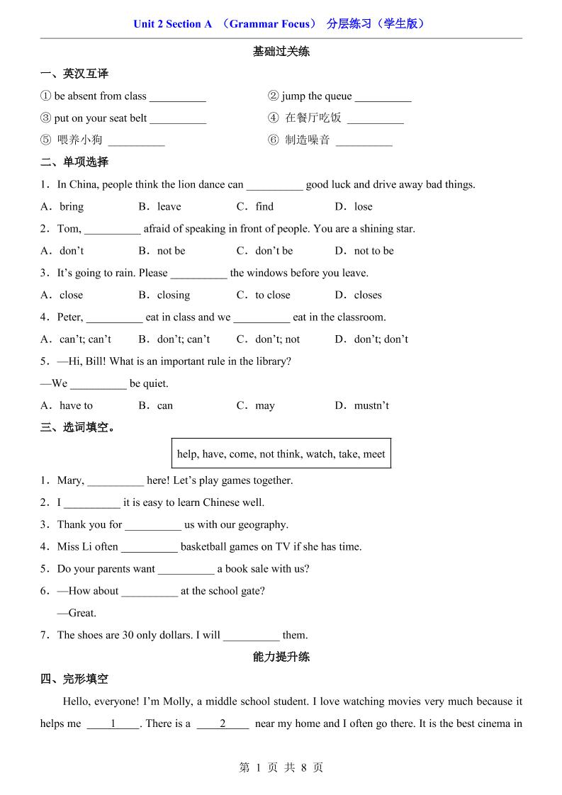 Unit 2 Section A(Grammar Focus)(分层练习)8